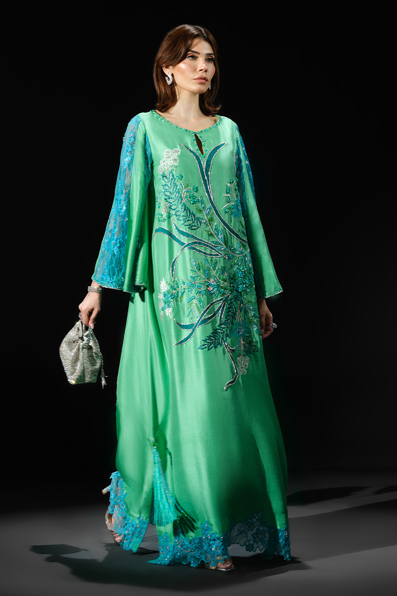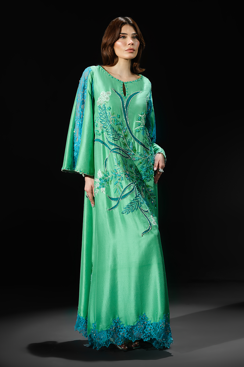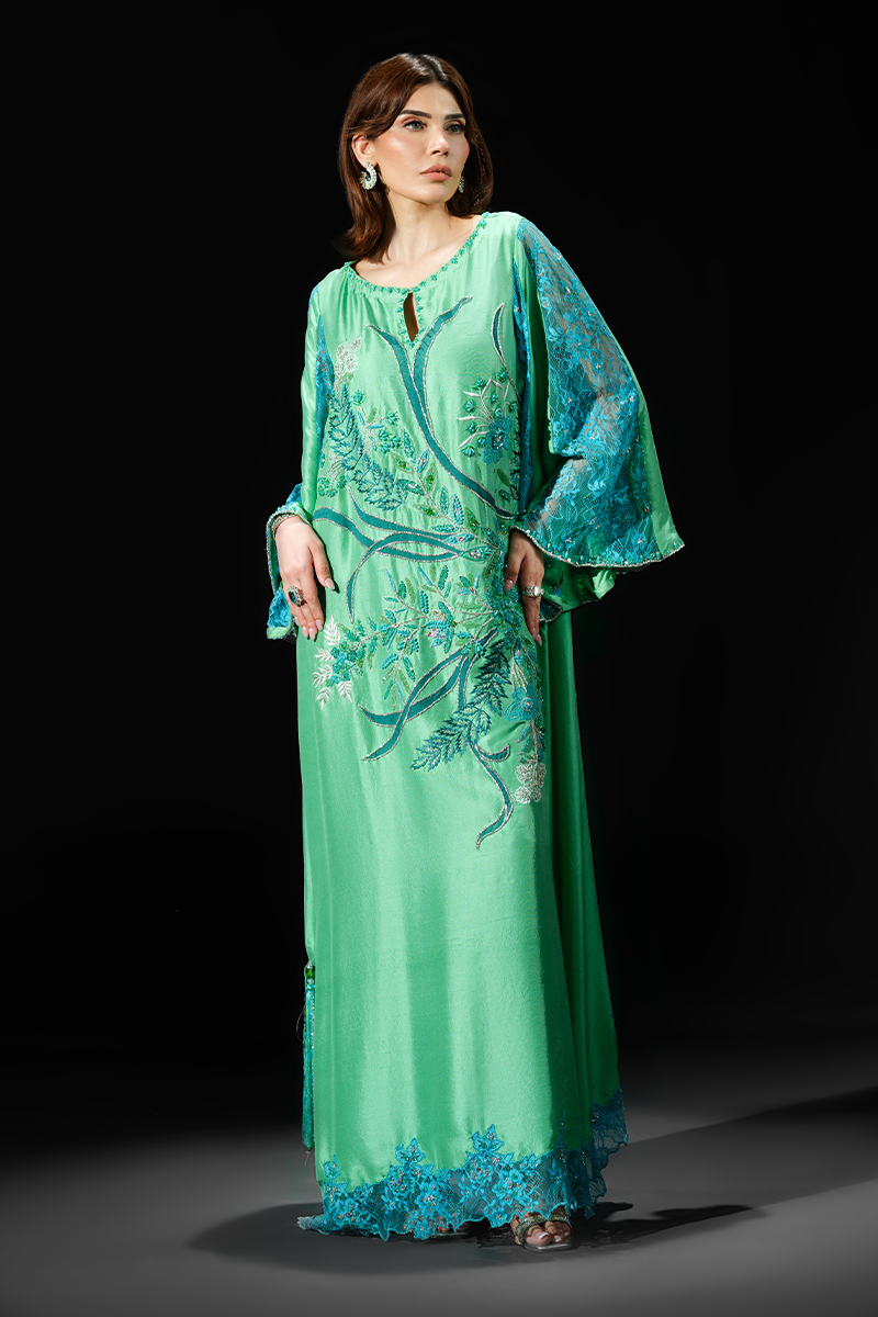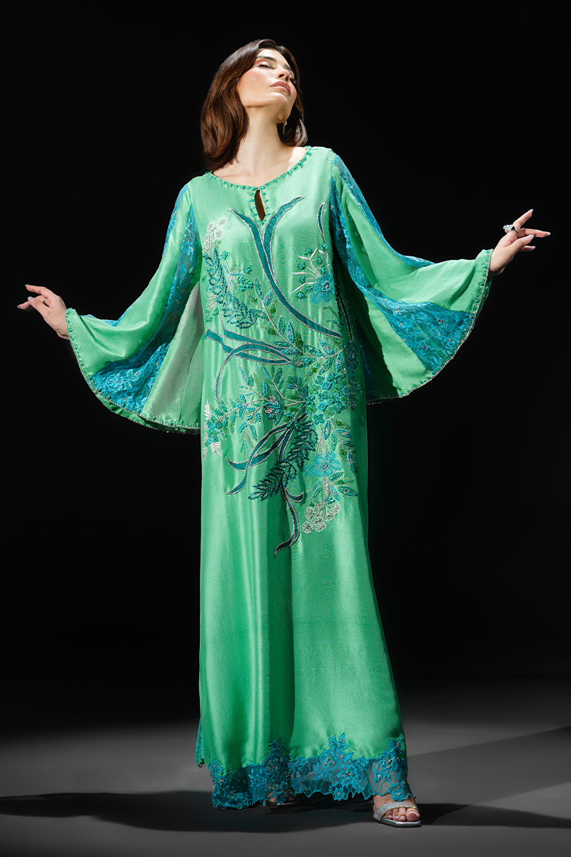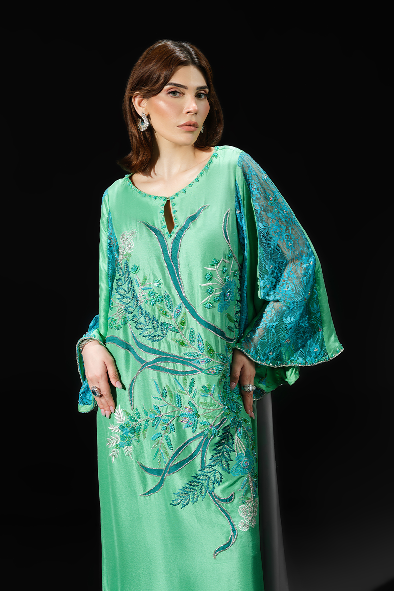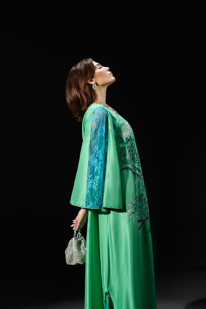 Featuring a stylish A-line silhouette, Aquamarine’s focal point is the hauntingly gorgeous motif on the front profile which culminates in a cluster of sparkles through hand applied sequins, beads and crystals around fine embroideries and appliqué details. To amplify its beautifully sculpted billowy sleeves, lightly embellished, delicate lace fabric insets have been used that add to the design’s ethereal charm. The hem is also masterfully outlined with hand embellished lace trims for a refined finishing touch. Undoubtedly a show-stopping dress that will flatter and delight!Model's Outfit