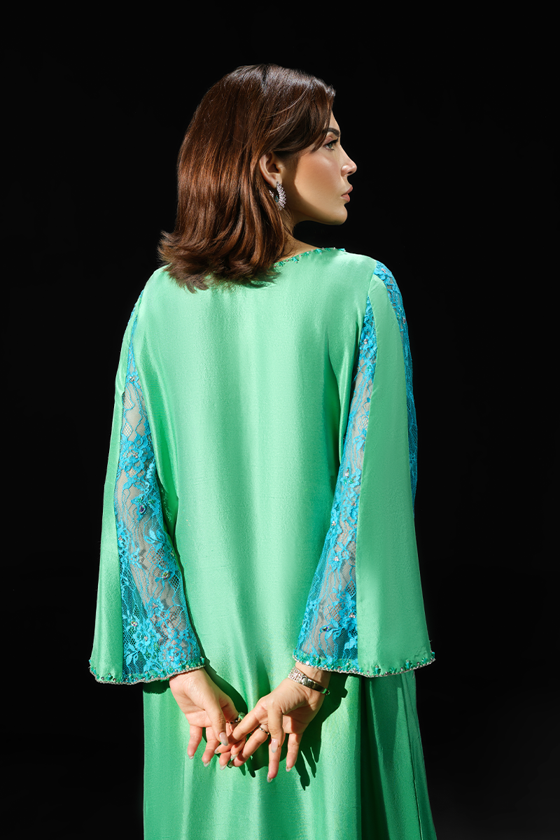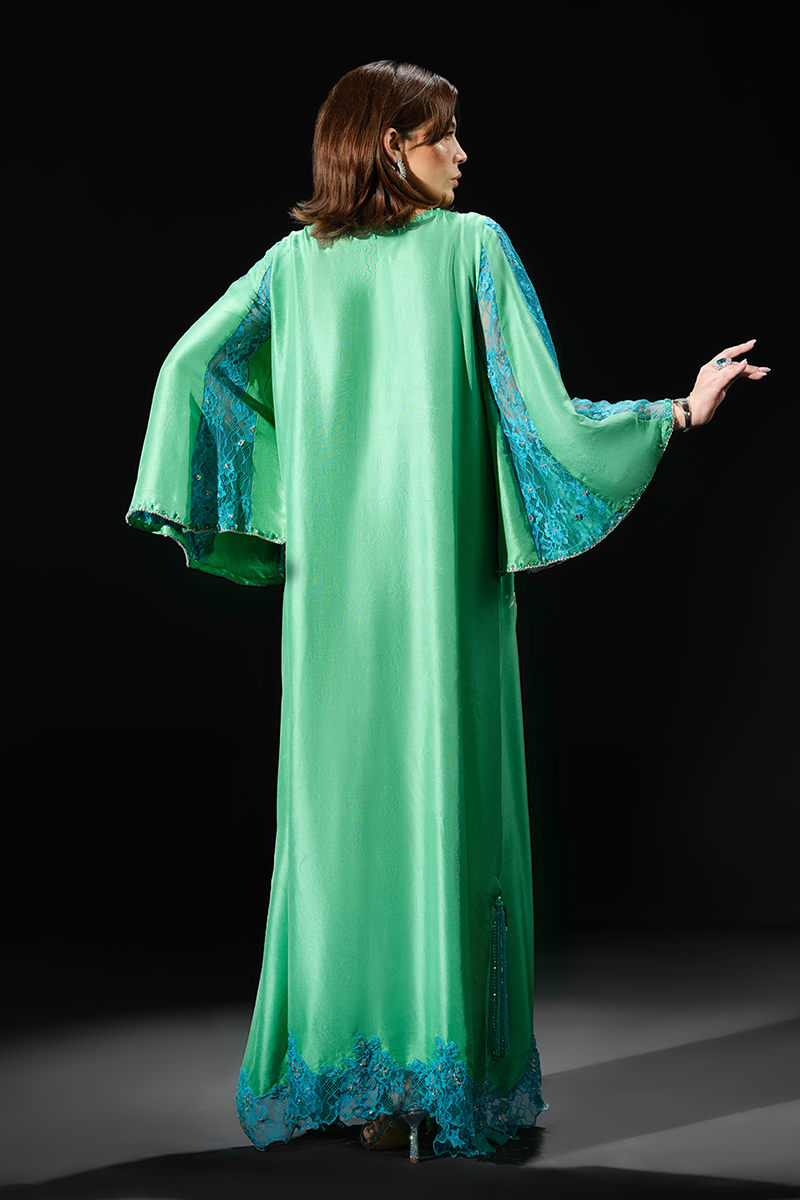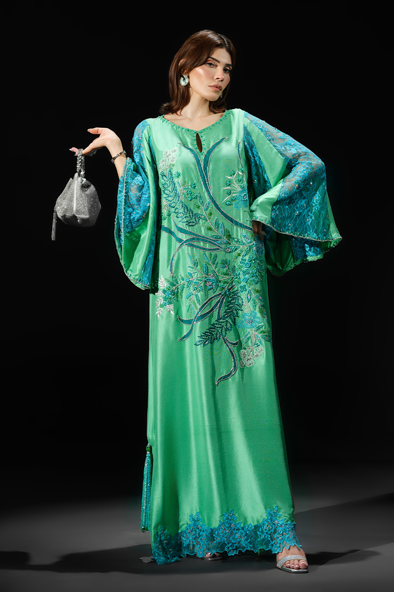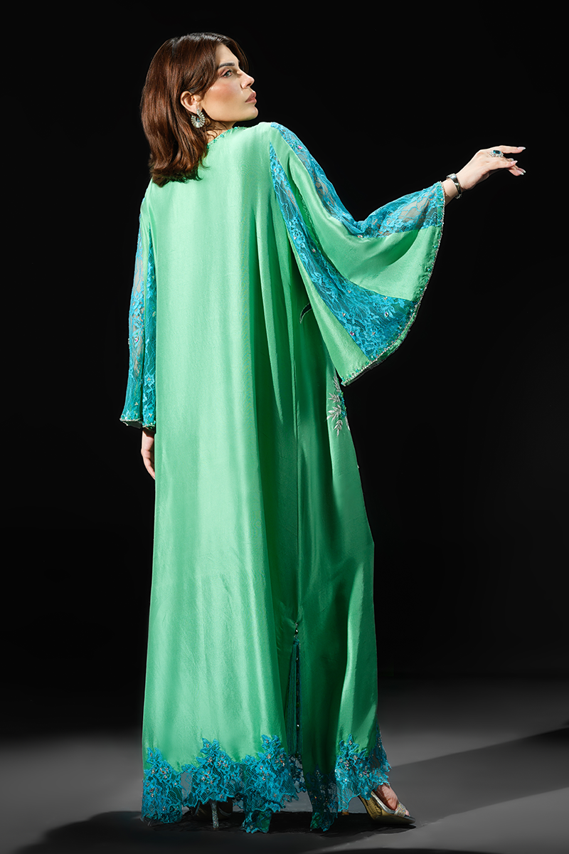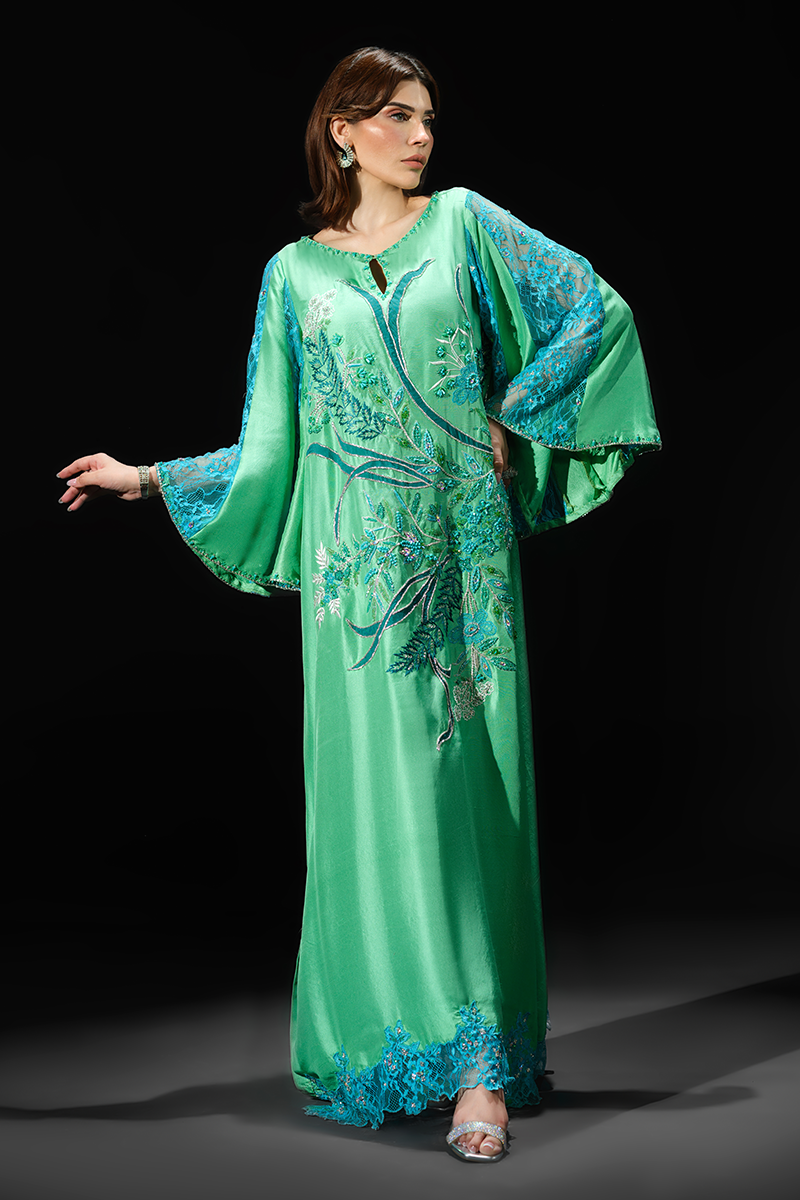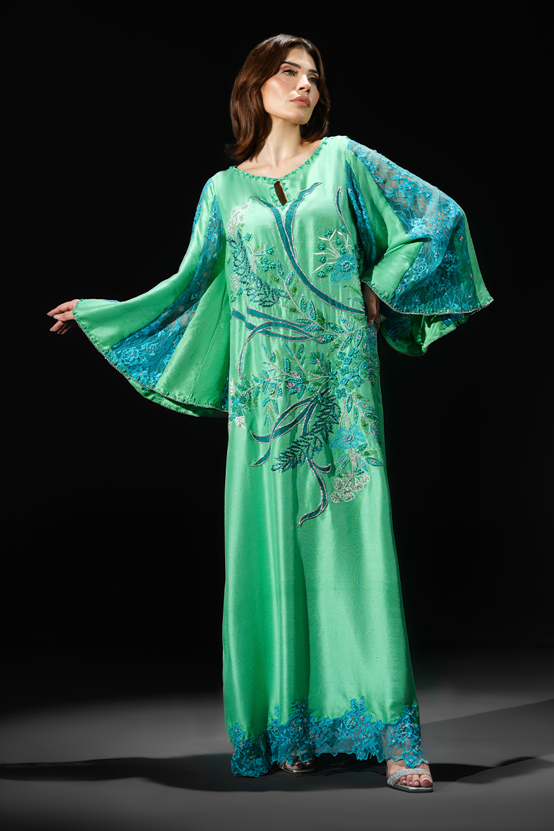 Featuring a stylish A-line silhouette, Aquamarine’s focal point is the hauntingly gorgeous motif on the front profile which culminates in a cluster of sparkles through hand applied sequins, beads and crystals around fine embroideries and appliqué details. To amplify its beautifully sculpted billowy sleeves, lightly embellished, delicate lace fabric insets have been used that add to the design’s ethereal charm. The hem is also masterfully outlined with hand embellished lace trims for a refined finishing touch. Undoubtedly a show-stopping dress that will flatter and delight!Model's Outfit