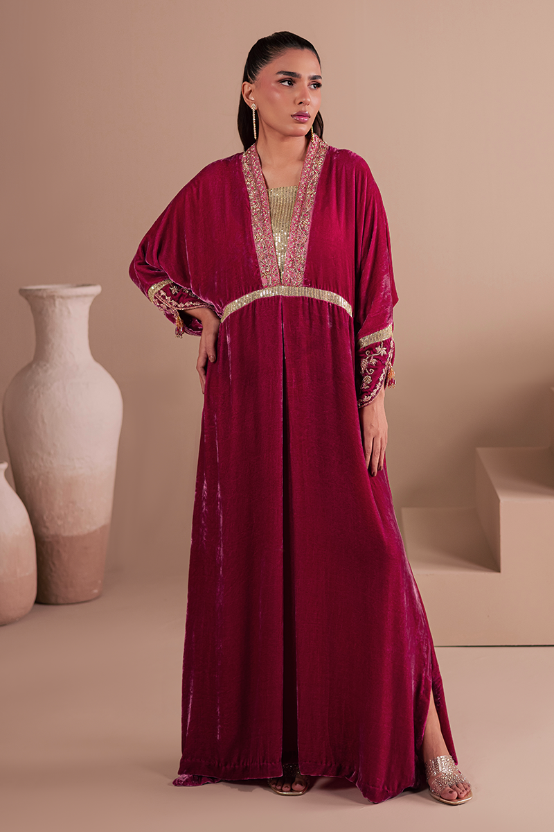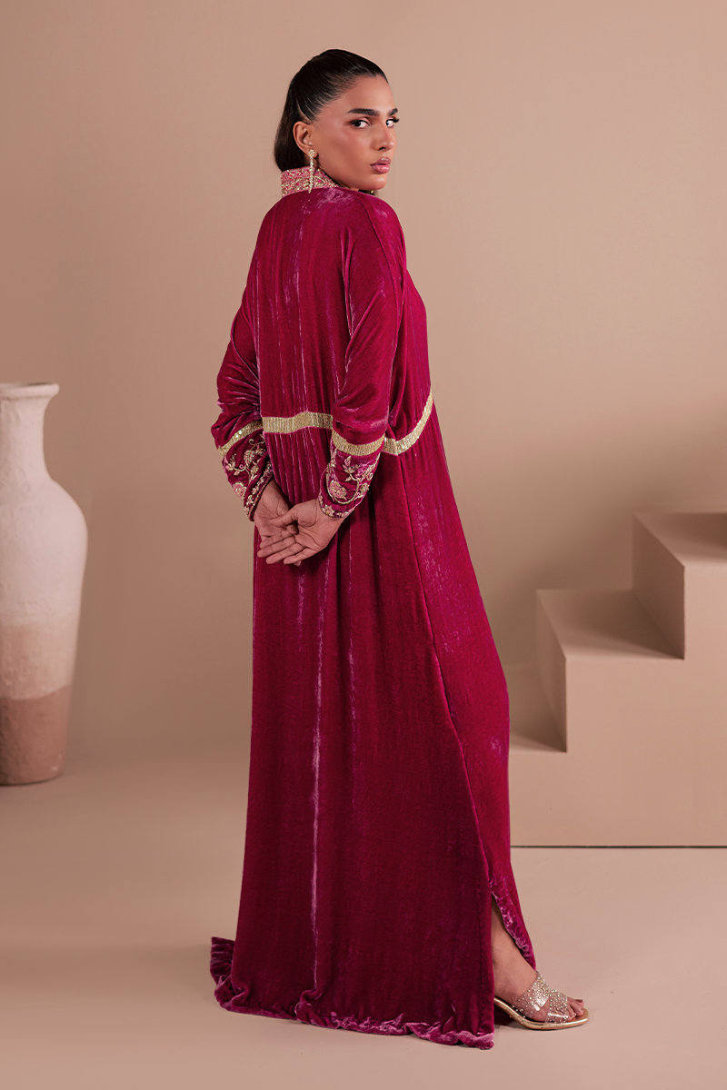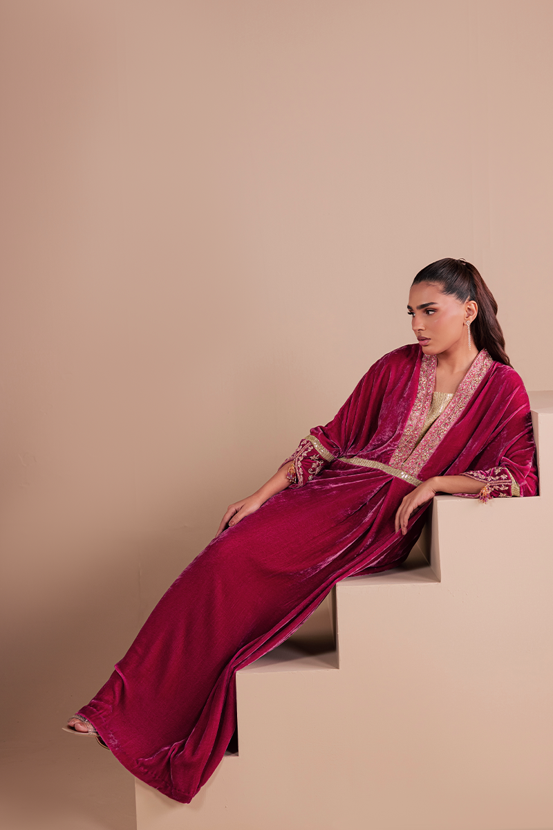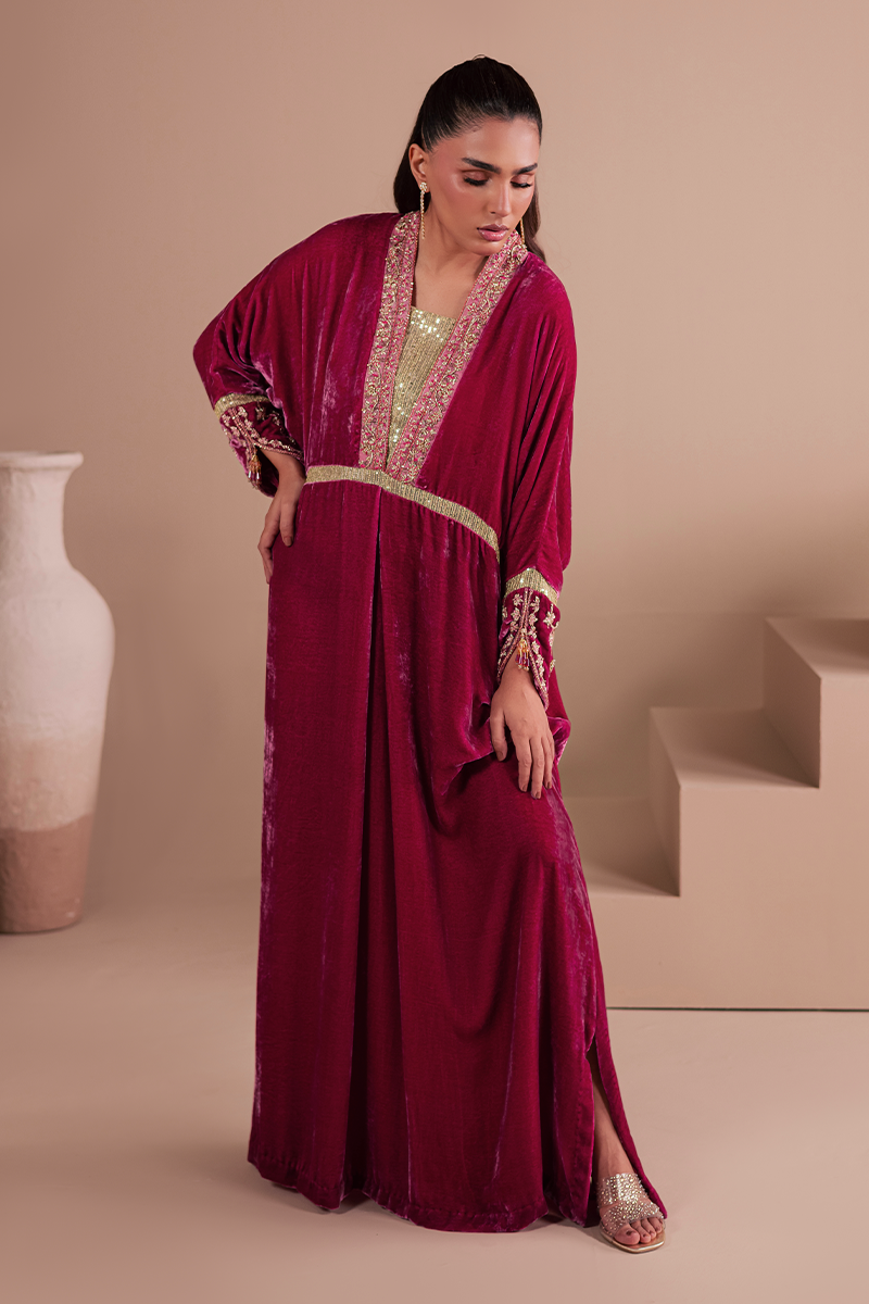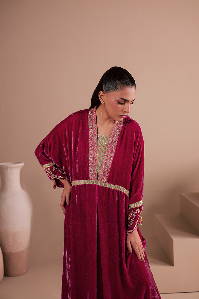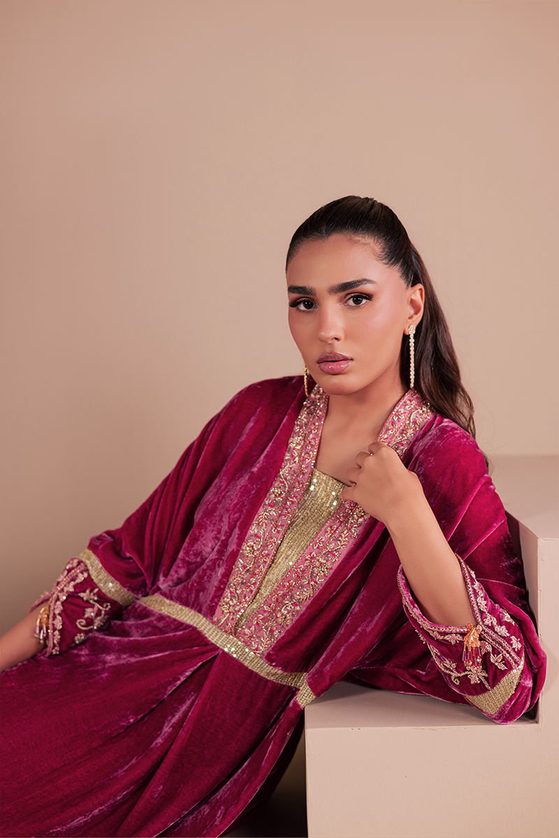 Constructed from pure French velvet in a sweeping Kaftaan silhouette and decorated with exquisite hand embellishments, Bolero is guaranteed to draw many a gaze. Exuding elegance to the core, it captivates with its rich pink hue, intricate zardozi handiwork and sequined fabric insets creating a look that's perfect for party and occasion dressing.Model's Outfit