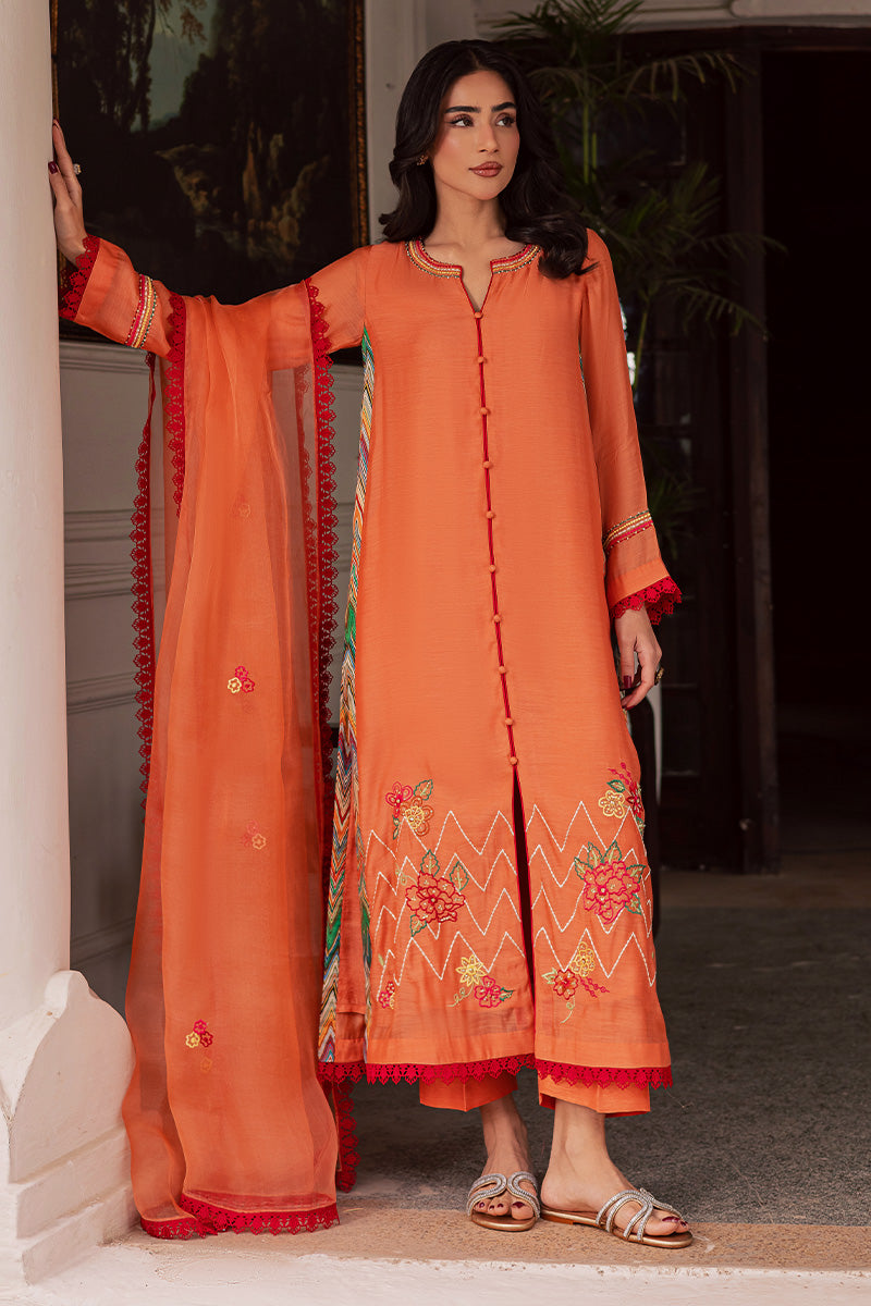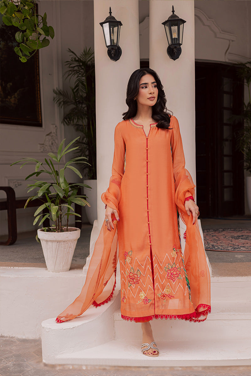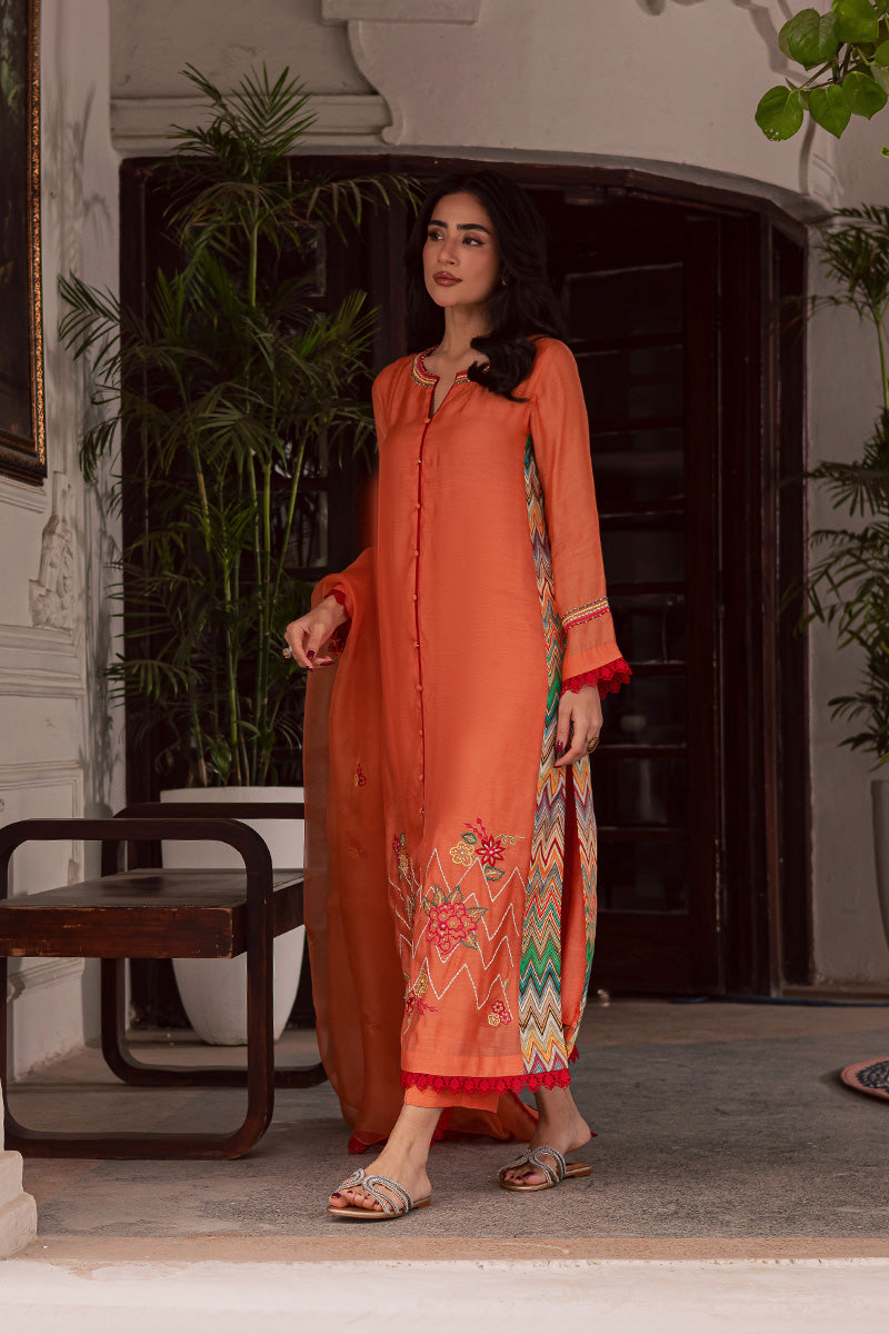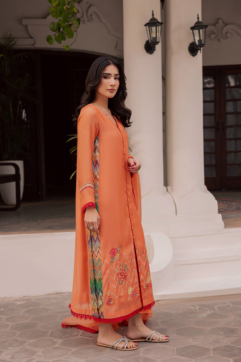 Designed for festive moments, Euphoria offers a sophisticated charm that’s both graceful and contemporary. The front-open long shirt is expertly tailored creating a refined silhouette. Featuring hand embellished delicate embroideries, printed panels and lace trims, this dress is the one where precision meets elegance. The accompanying organza dupatta is light as a feather and is adorned with embroidered florals and finished with lace trim.Model's Outfit