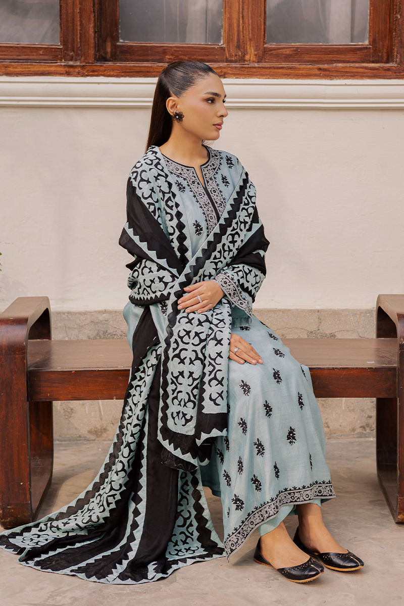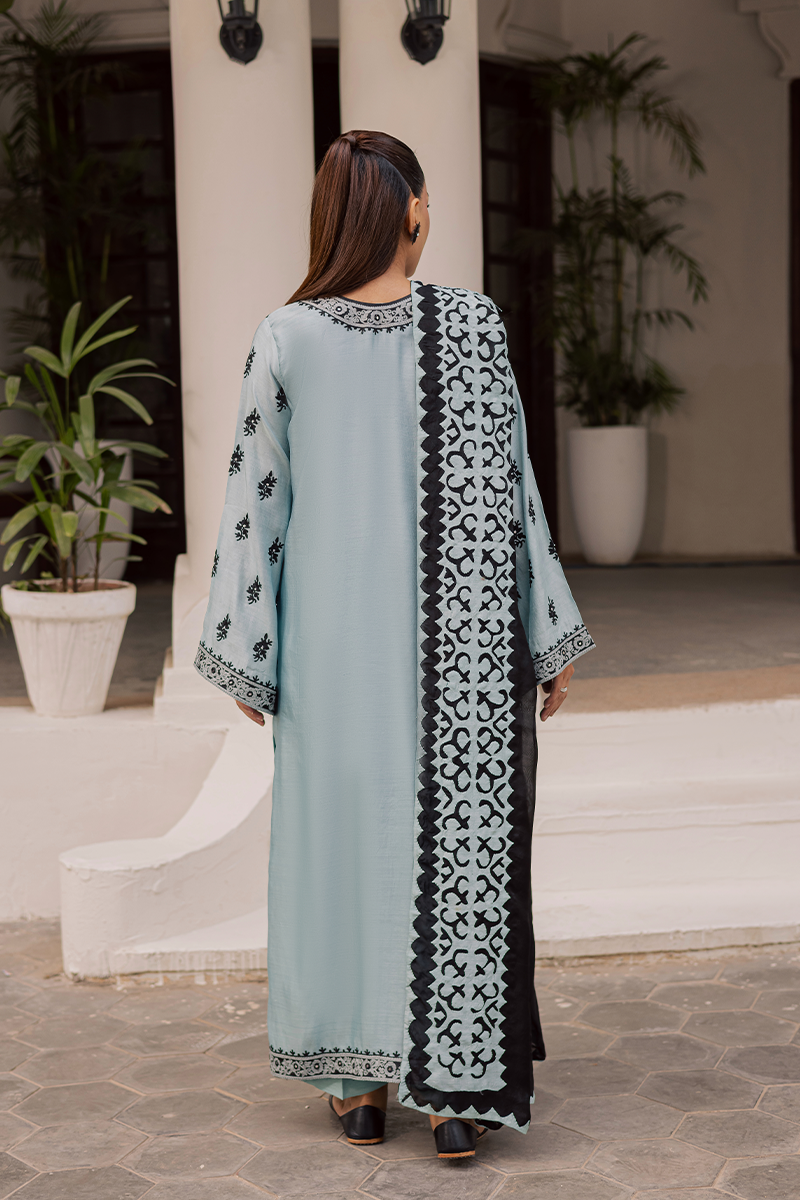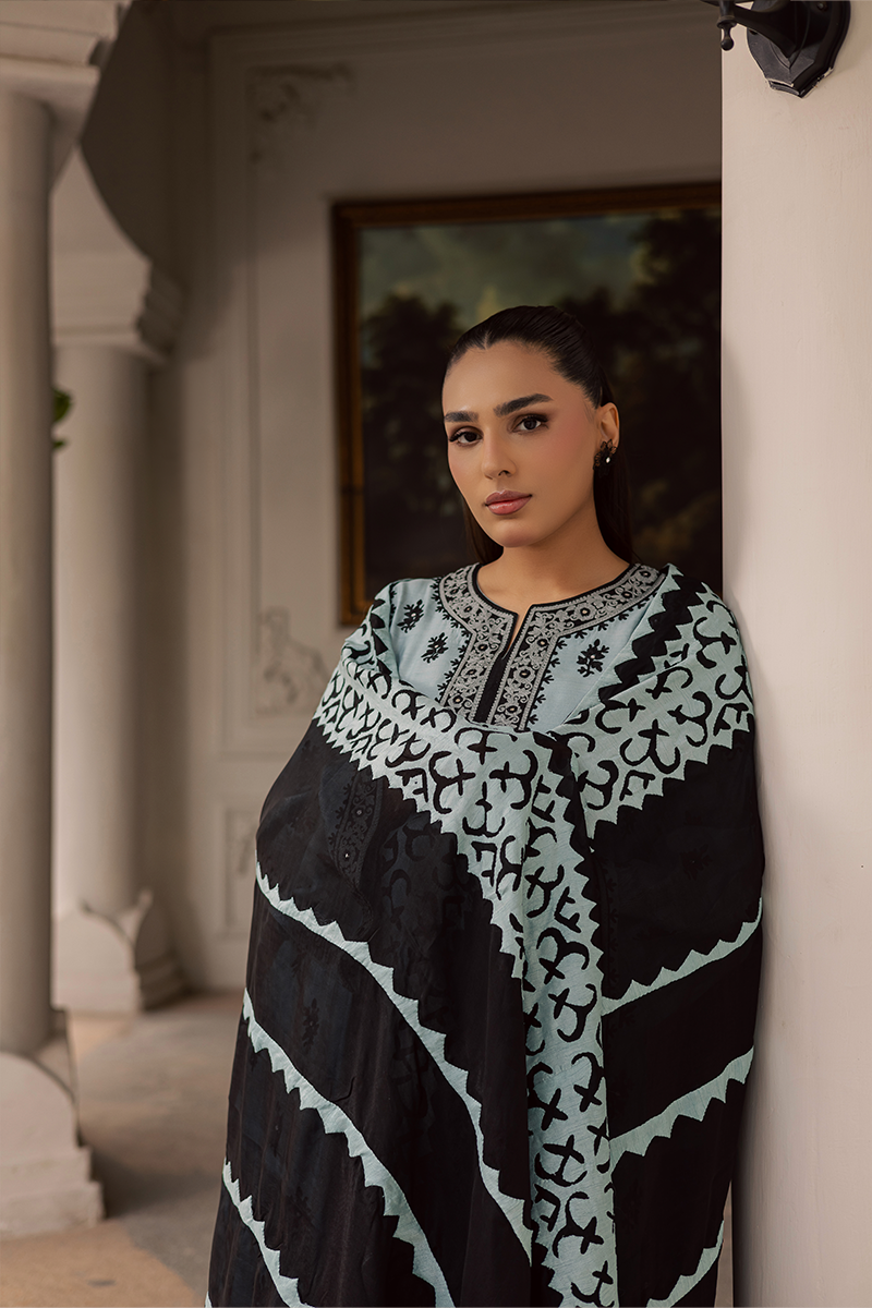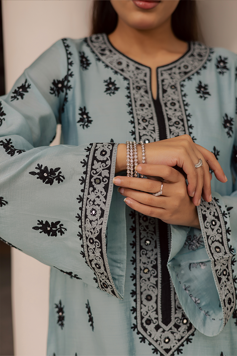 The most befitting choice to celebrate Eid in, Glee is a true portrait of grace that culminates in a masterclass in handcrafted elegance. Meticulous Rilli work on luxurious silk dupatta is nothing short of extraordinary and traditional Aari embroidery gracing the shirt showcases refined work of precision and fine artisanship. Hand-applied sequins further elevate this exceptional piece.Model's Outfit