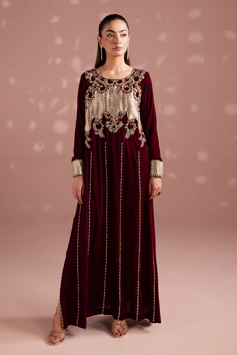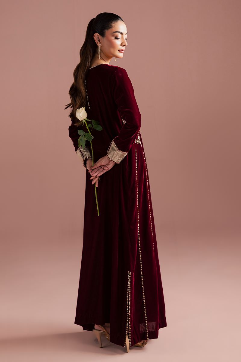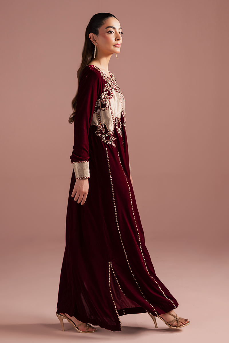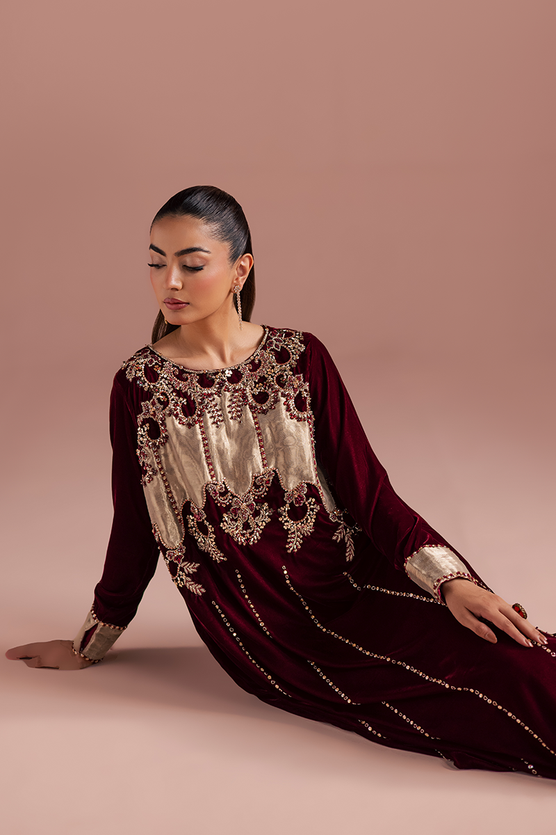 A sumptuous burgundy velvet kaftan, rich and regal, drapes with luxurious softness. The intricate hand-worked bodice crafted from pure tissue appliqué, is adorned with gleaming zardozi embroidery, shimmering beads, and lustrous stones that glow dazzlingly. Each embellishment catches the light with opulent brilliance, cascading down gracefully along the front profile. The velvet itself, rich and plush, exudes a sense of majestic elegance, while the craftsmanship speaks of timeless refinement and royal allure.Model's Outfit
