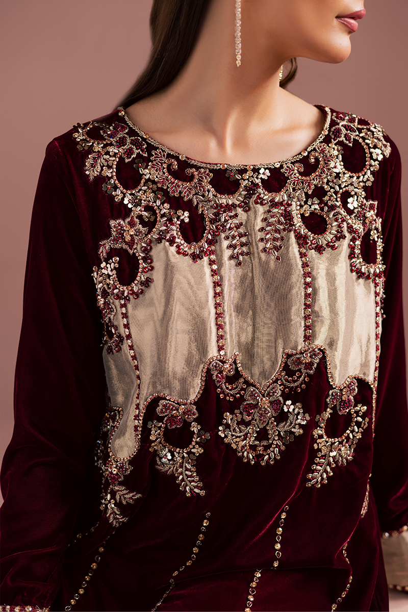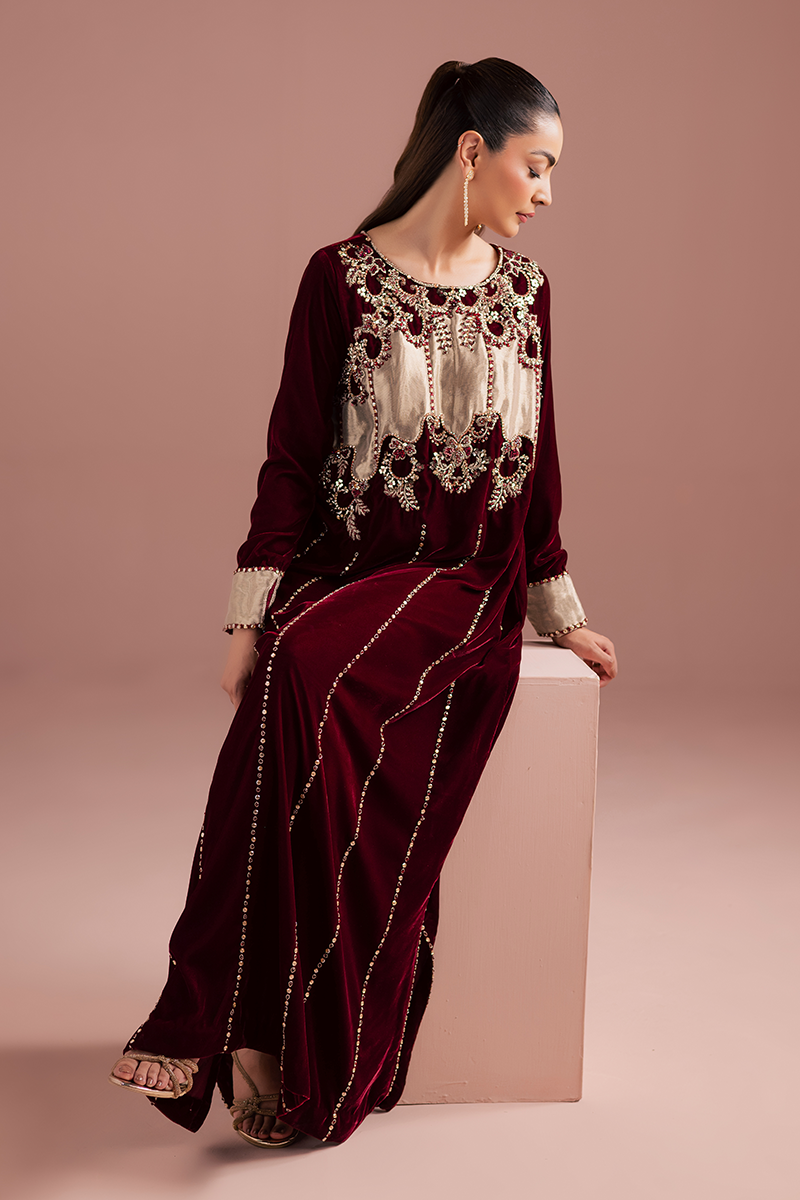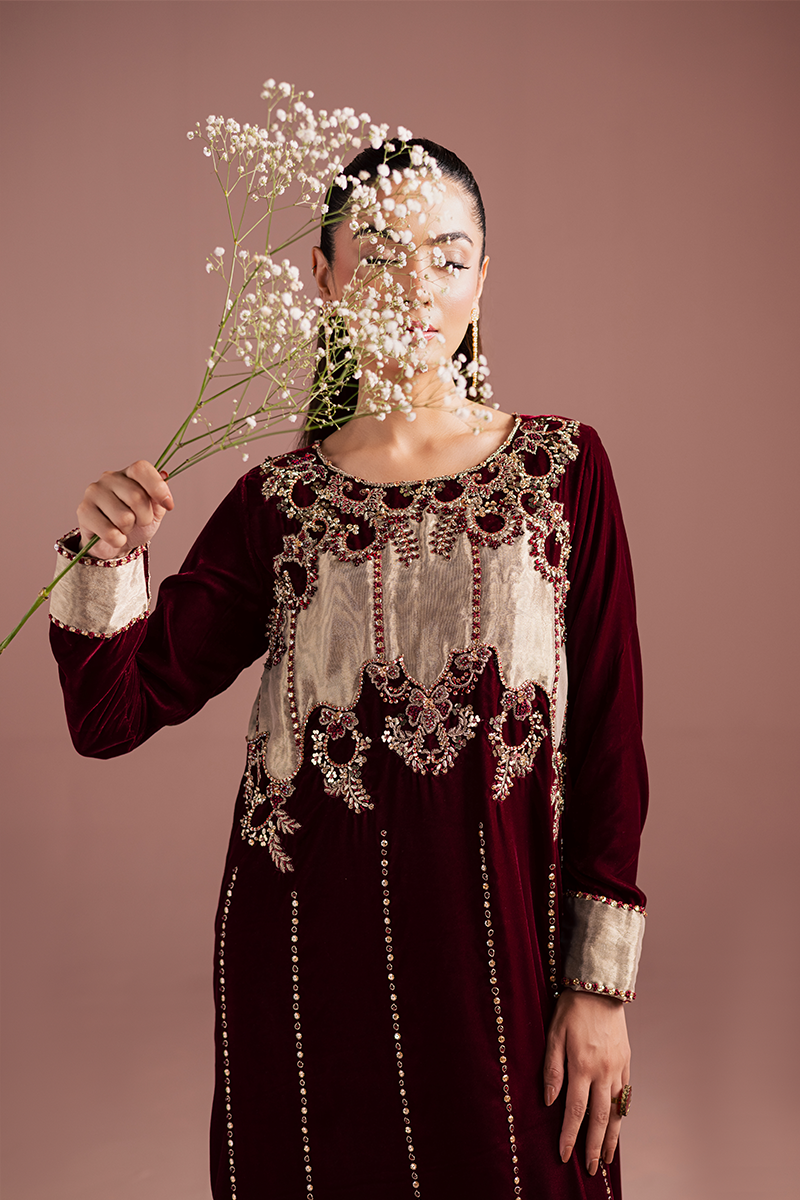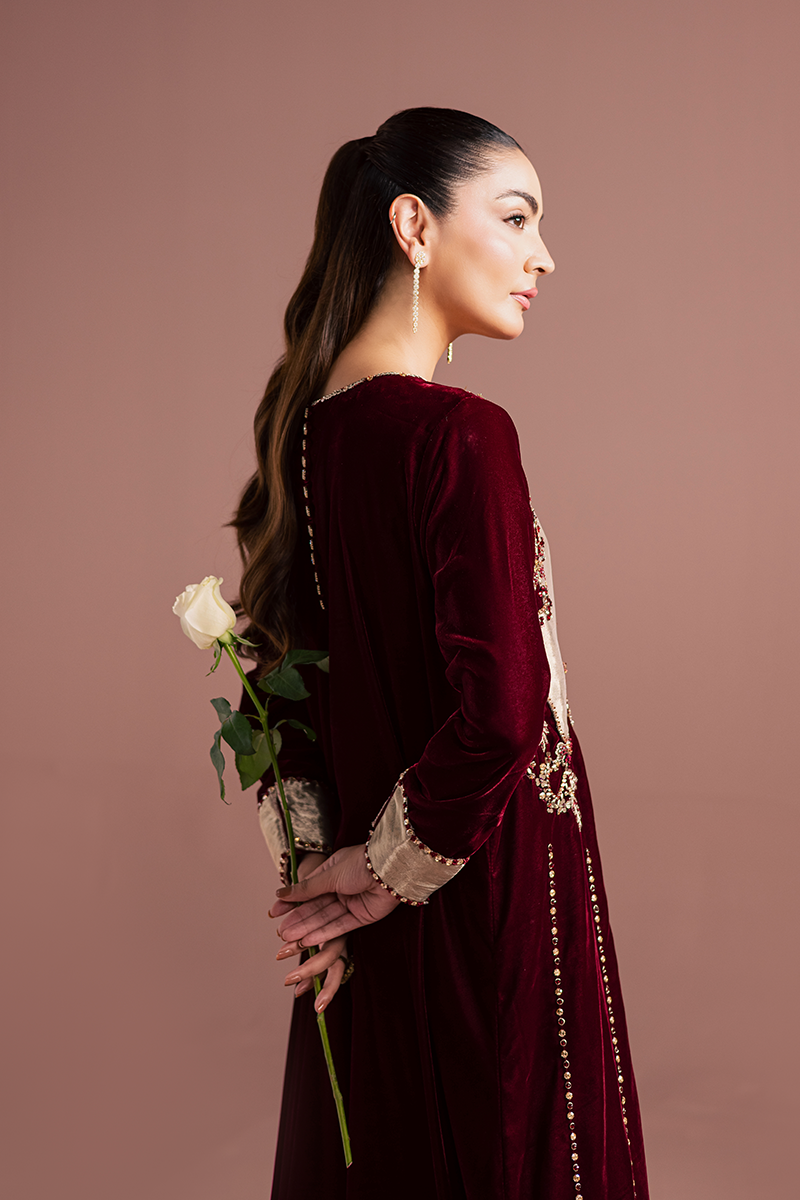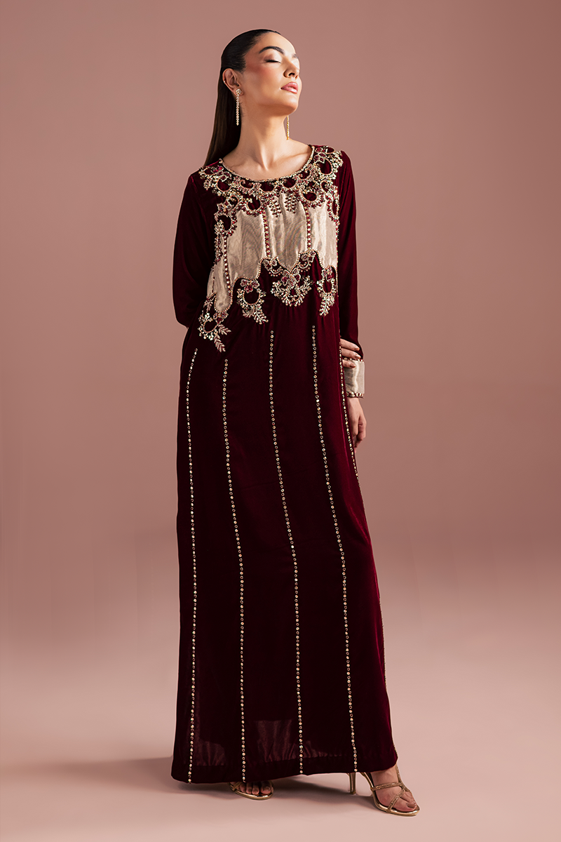 A sumptuous burgundy velvet kaftan, rich and regal, drapes with luxurious softness. The intricate hand-worked bodice crafted from pure tissue appliqué, is adorned with gleaming zardozi embroidery, shimmering beads, and lustrous stones that glow dazzlingly. Each embellishment catches the light with opulent brilliance, cascading down gracefully along the front profile. The velvet itself, rich and plush, exudes a sense of majestic elegance, while the craftsmanship speaks of timeless refinement and royal allure.Model's Outfit