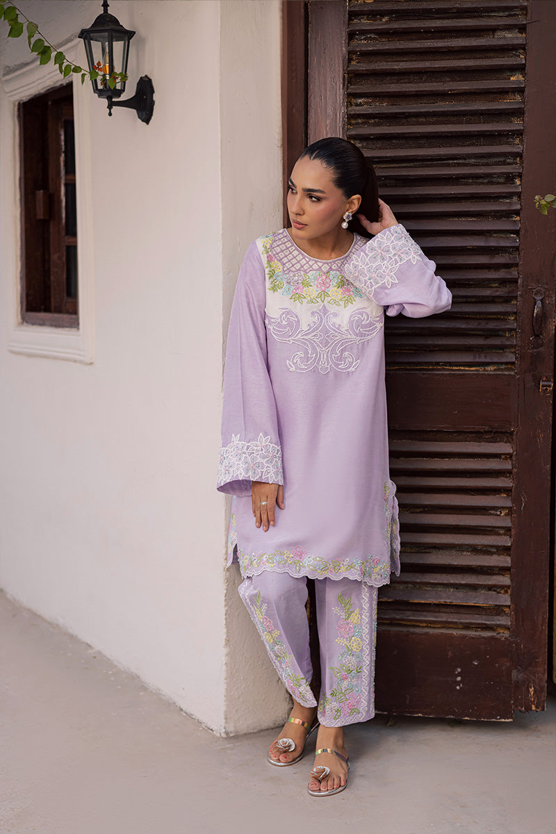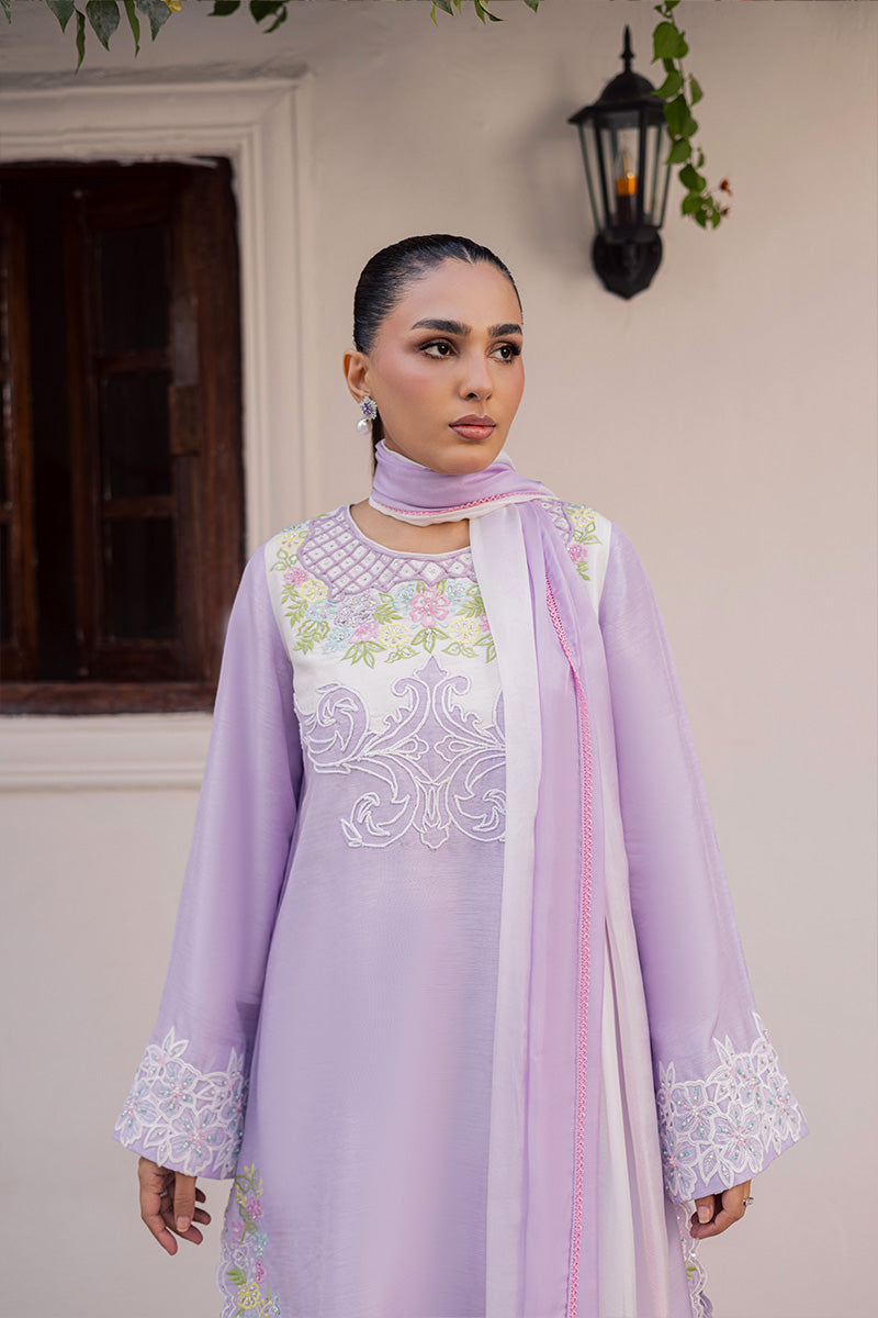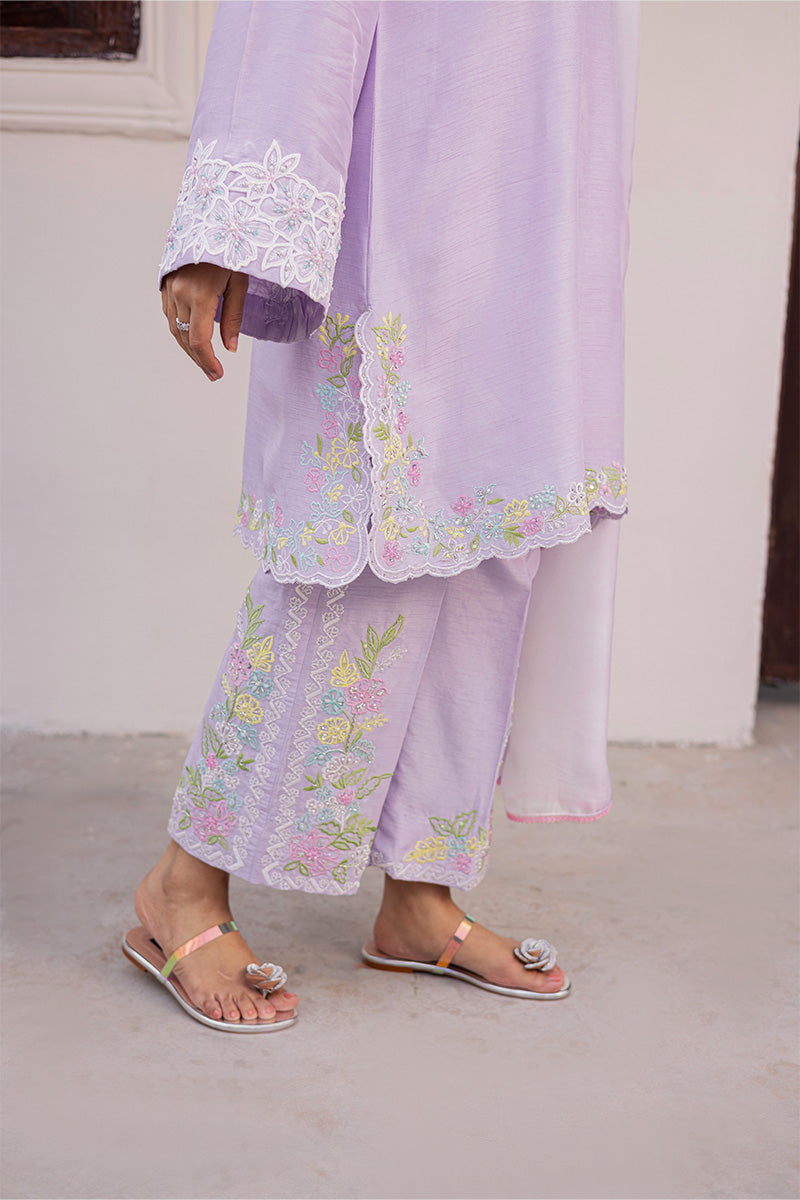 Joie is a symphony of vibrance and panache that captivates with its eye-catching silhouette and colour-block construction, defined by a stunning neckline featuring unique dori work. Its artisanal touch becomes even more apparent with sequins scattered throughout the delicately embroidered motifs to create a soft glimmer that delivers an unyielding sense of glamour. Finished with hand embellished lace trims and dainty tassels, this ensemble is guaranteed to make you outshine everyone at Eid get-togethers.Model's Outfit