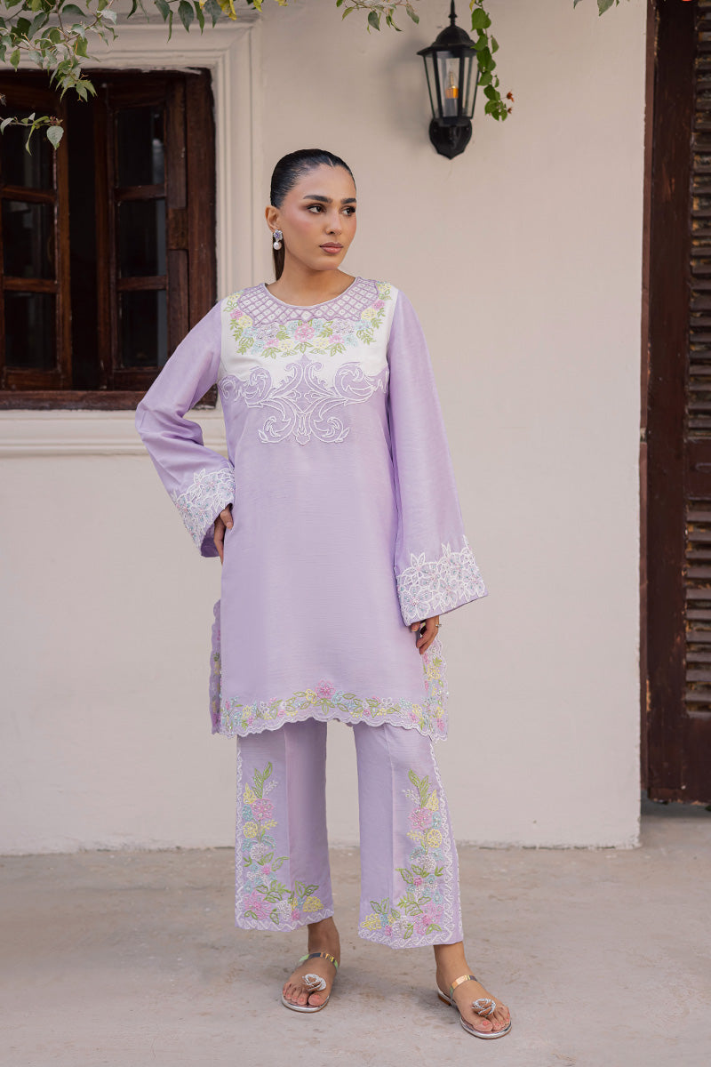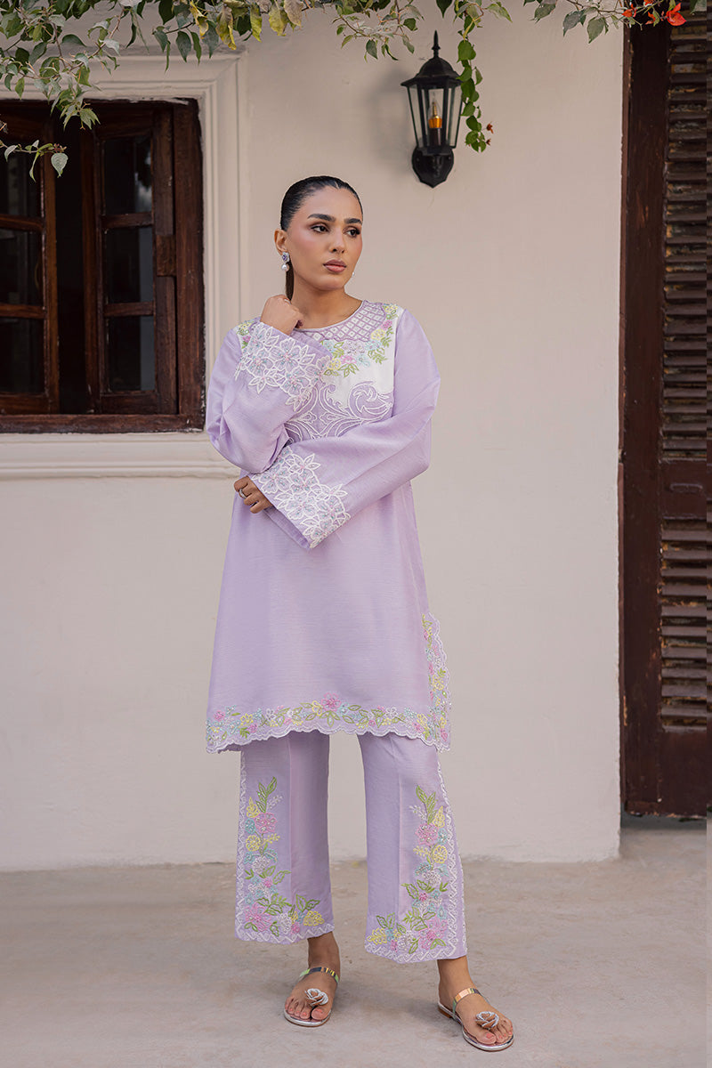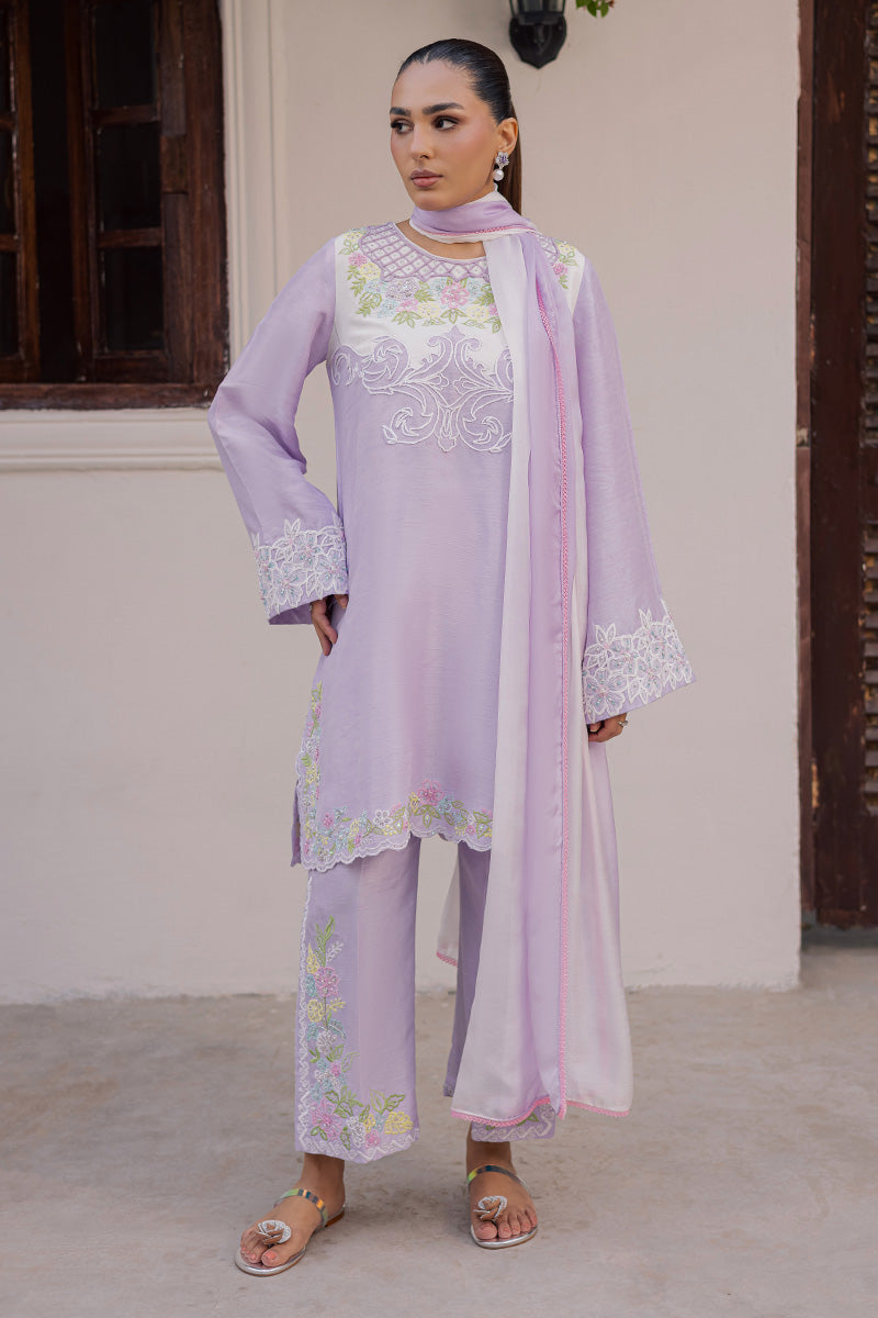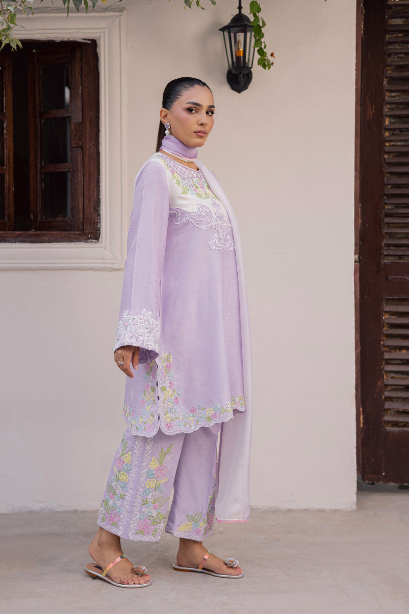 Joie is a symphony of vibrance and panache that captivates with its eye-catching silhouette and colour-block construction, defined by a stunning neckline featuring unique dori work. Its artisanal touch becomes even more apparent with sequins scattered throughout the delicately embroidered motifs to create a soft glimmer that delivers an unyielding sense of glamour. Finished with hand embellished lace trims and dainty tassels, this ensemble is guaranteed to make you outshine everyone at Eid get-togethers.Model's Outfit