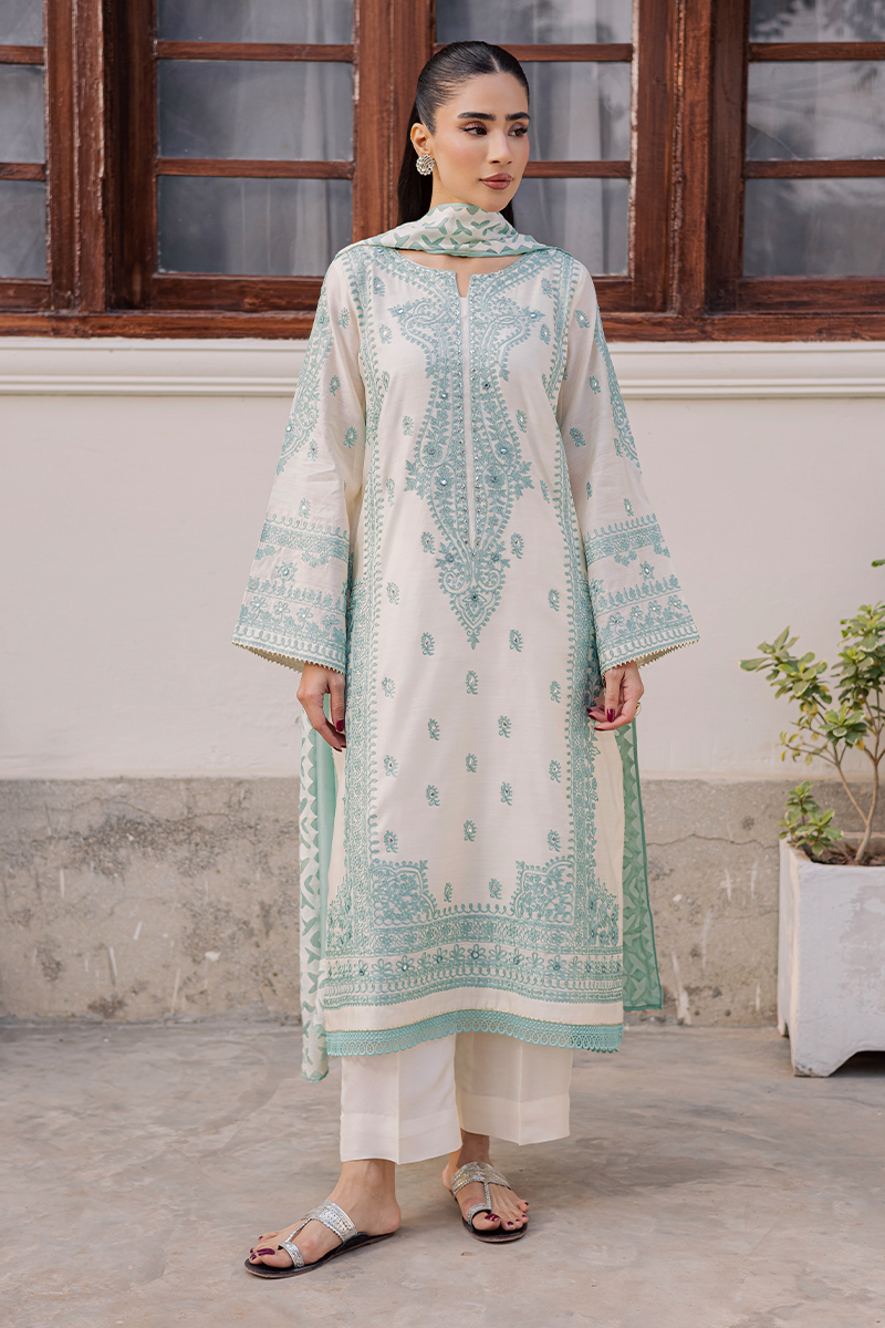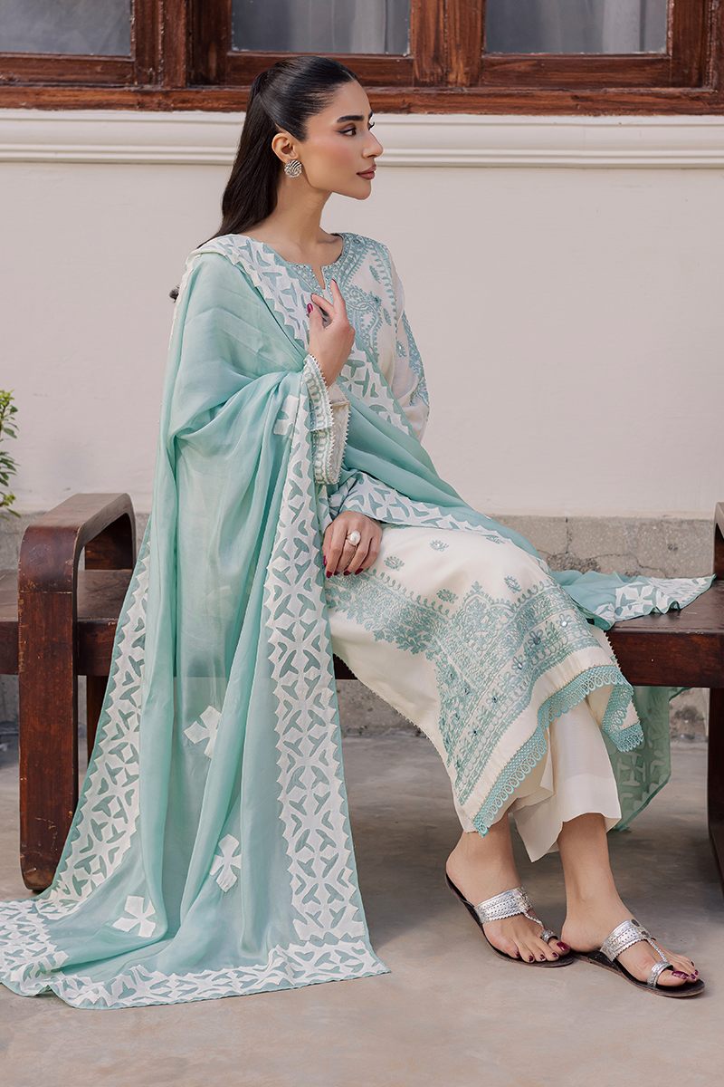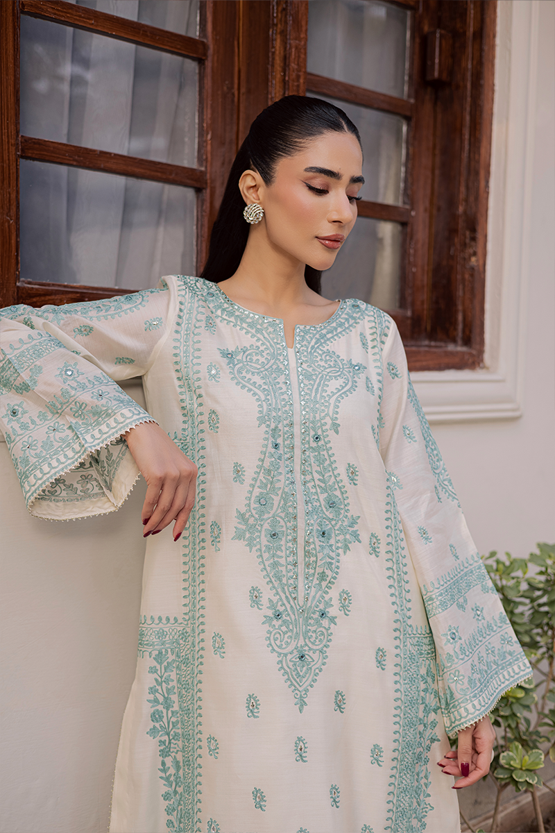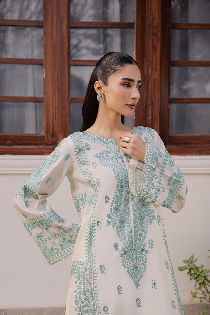 Capturing the brand’s signature penchant for traditional artistry and refined sophistication, Jubilance is crafted from pure Khaddi silk featuring intricate Aari embroidery. The star of the show is its handcrafted silk dupatta showcasing exquisite Rilli work. The soothing blend of cool aqua and warm off-white lends the dress a serene and calming appeal. This ensemble, with its innate elegance, is just perfect for family gatherings and joyful moments this Eid.Model's Outfit