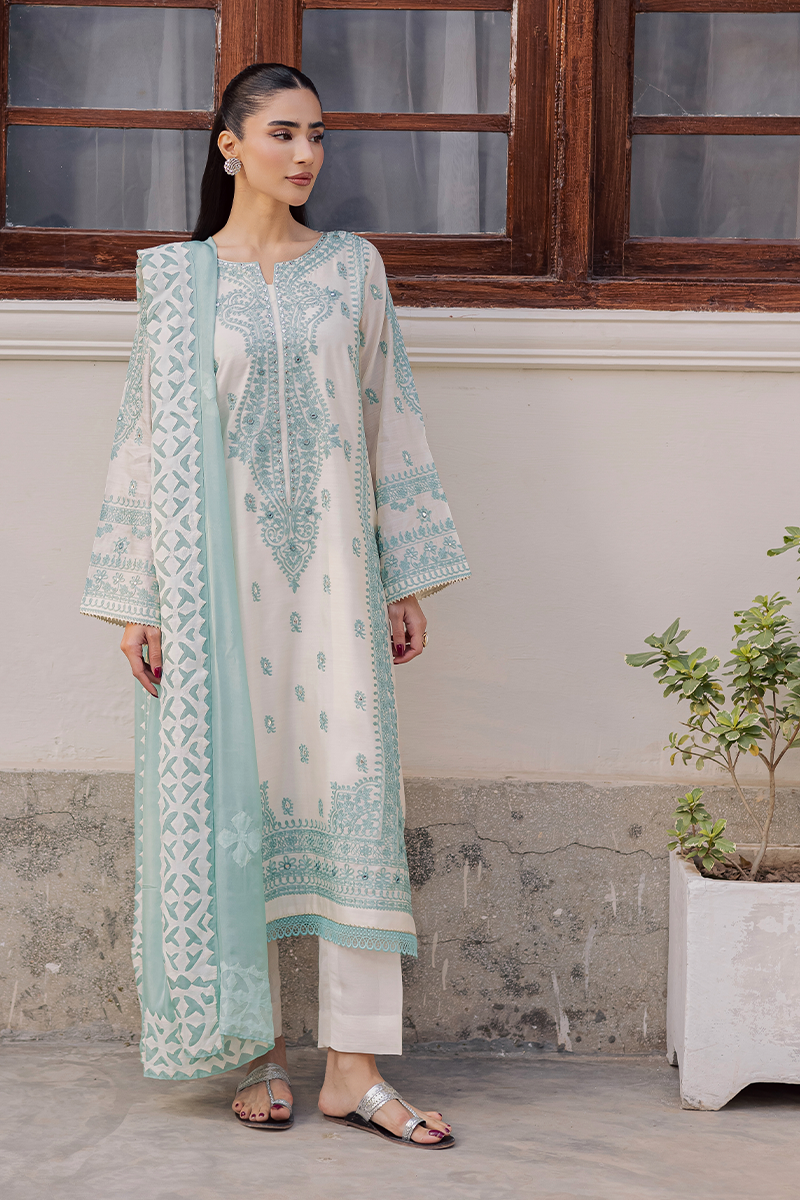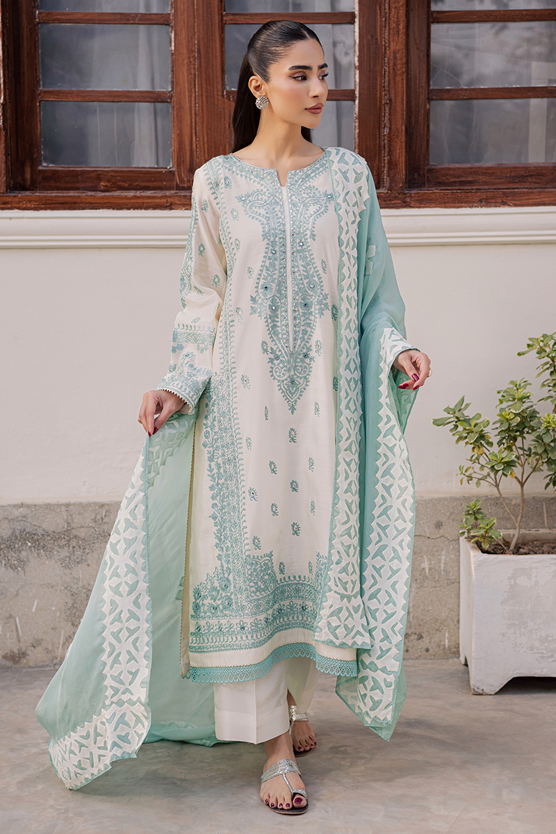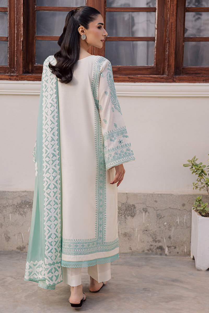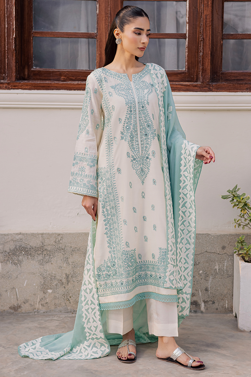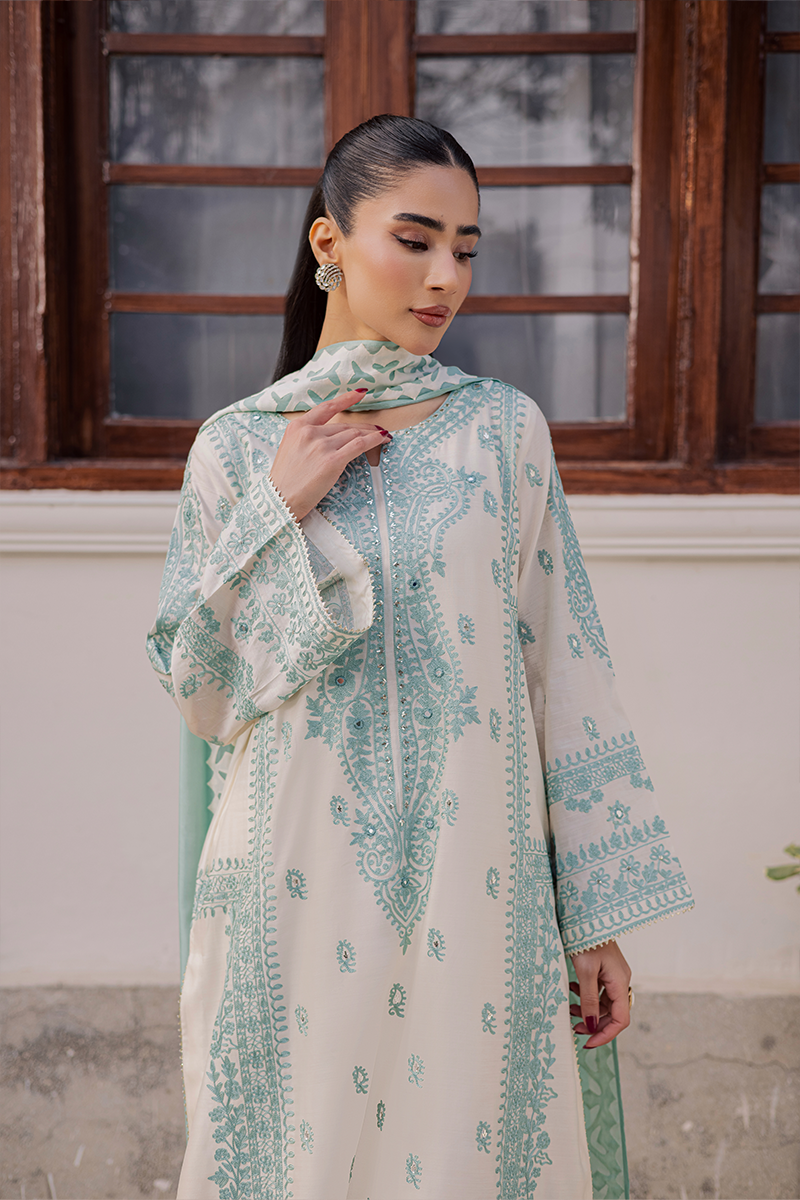 Capturing the brand’s signature penchant for traditional artistry and refined sophistication, Jubilance is crafted from pure Khaddi silk featuring intricate Aari embroidery. The star of the show is its handcrafted silk dupatta showcasing exquisite Rilli work. The soothing blend of cool aqua and warm off-white lends the dress a serene and calming appeal. This ensemble, with its innate elegance, is just perfect for family gatherings and joyful moments this Eid.Model's Outfit