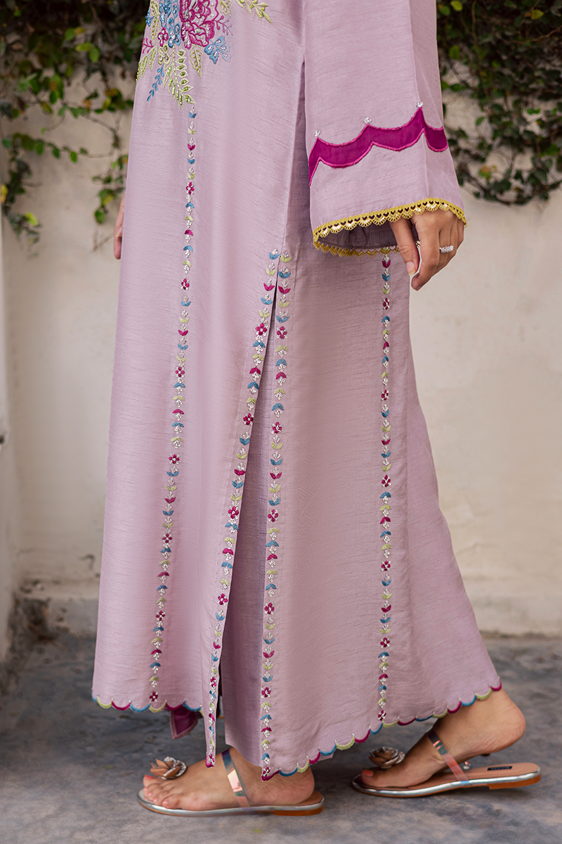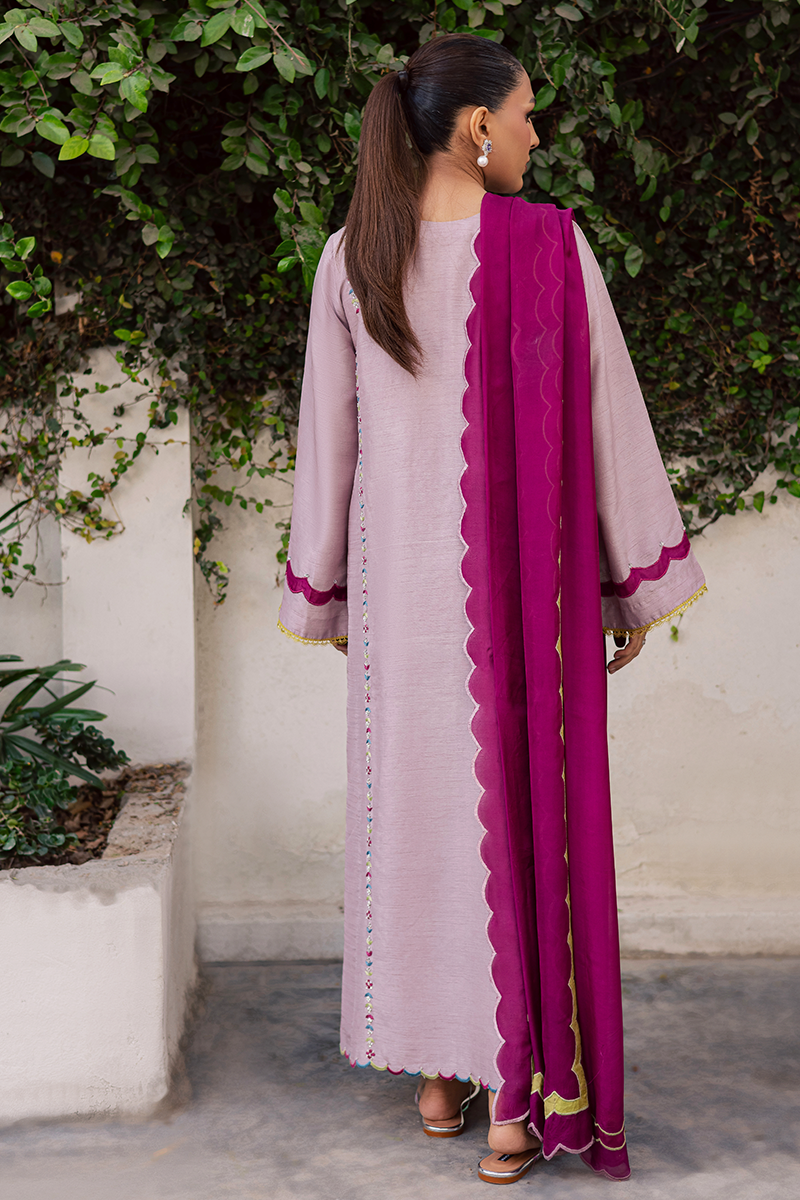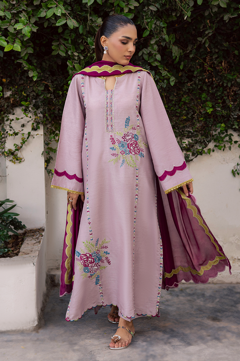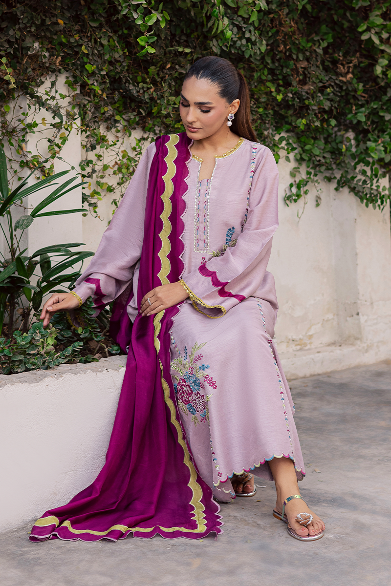 Mirth pulls full focus with a display of delicately adorned sequins and beads that illuminate the embroidered motifs enhanced with appliqué details. It is a true reflection of the brand’s signature attention to detail, with every stitch and embellishment thoughtfully placed. The accompanying silk dupatta complements the dress beautifully, with scalloped edges and appliqué borders all around, creating a cohesive and festive look. Perfect for the joyous occasion, this ensemble balances sophistication with celebratory charm, making it an ideal choice for Eid gatherings and festivities.Model's Outfit