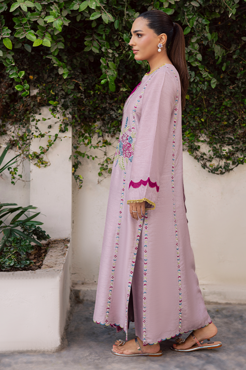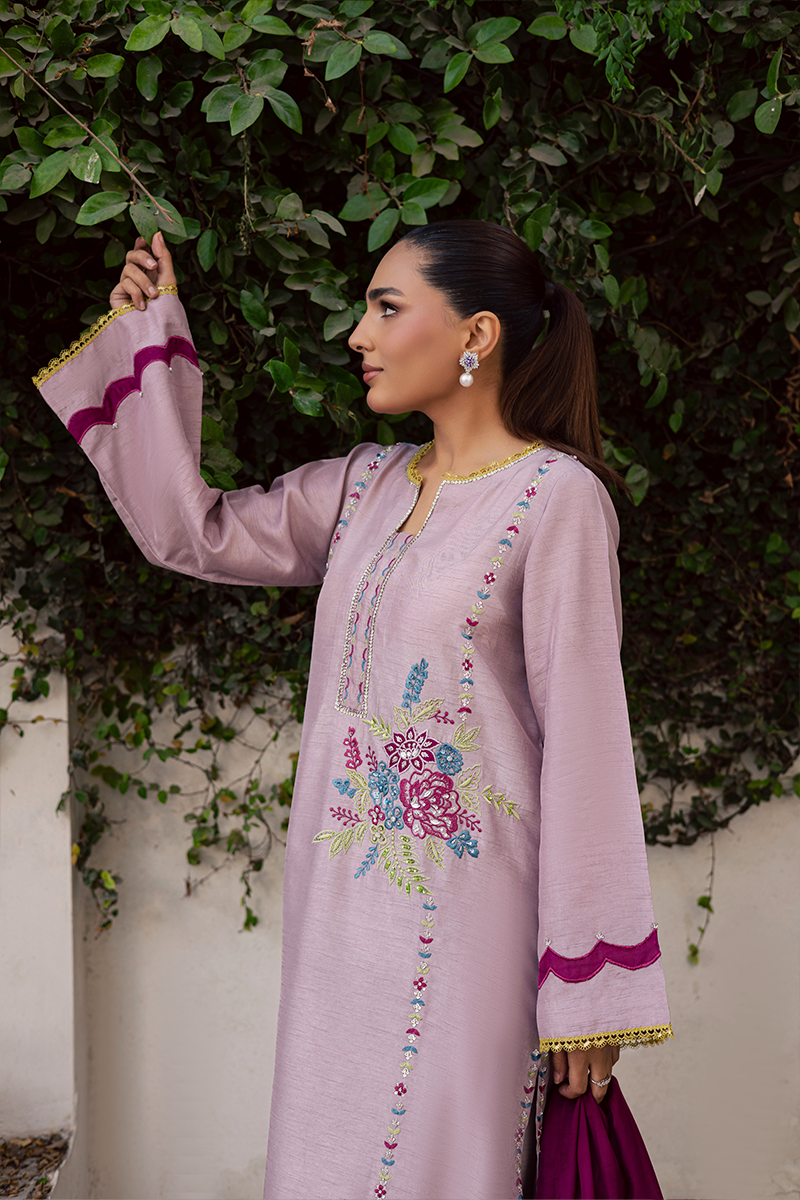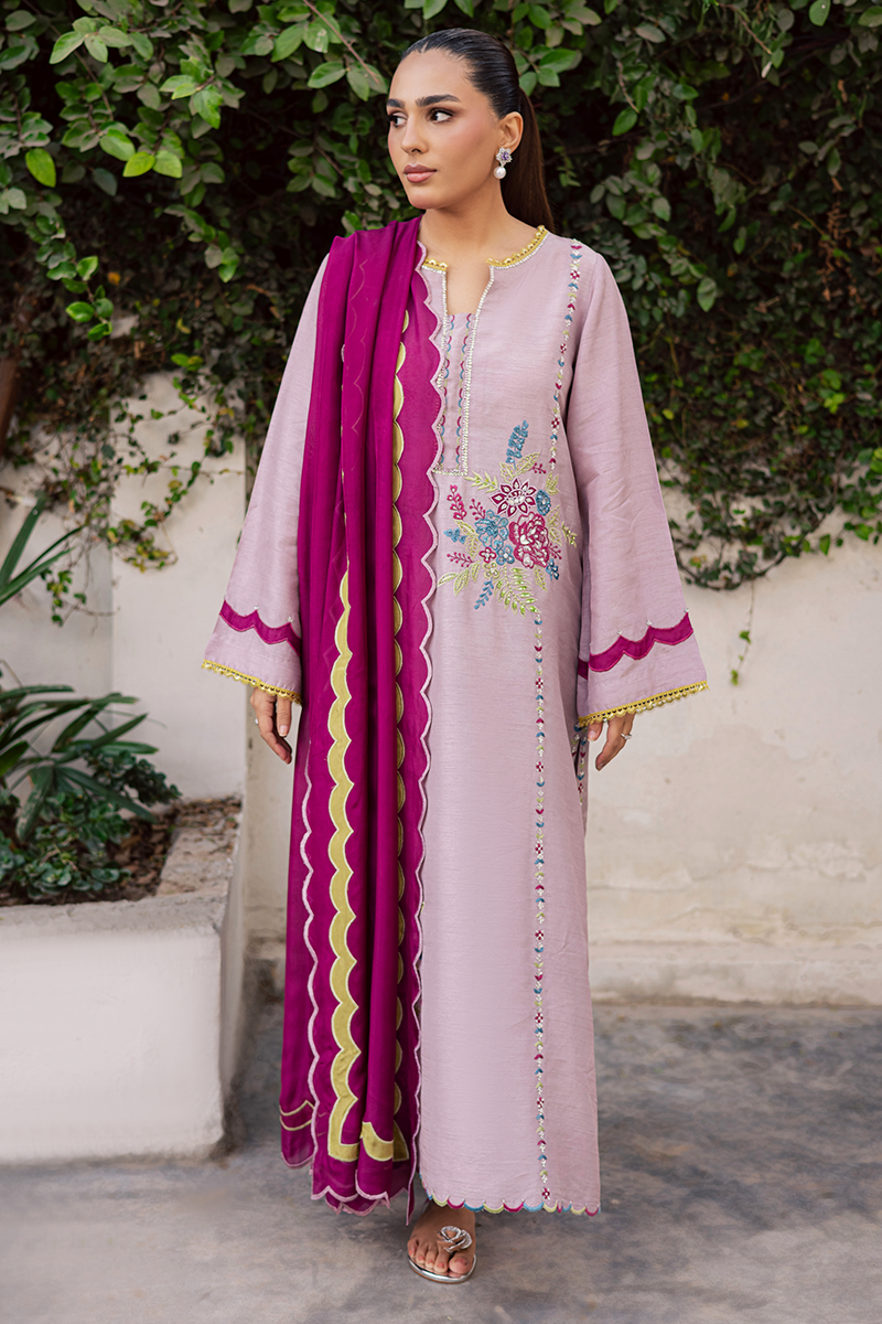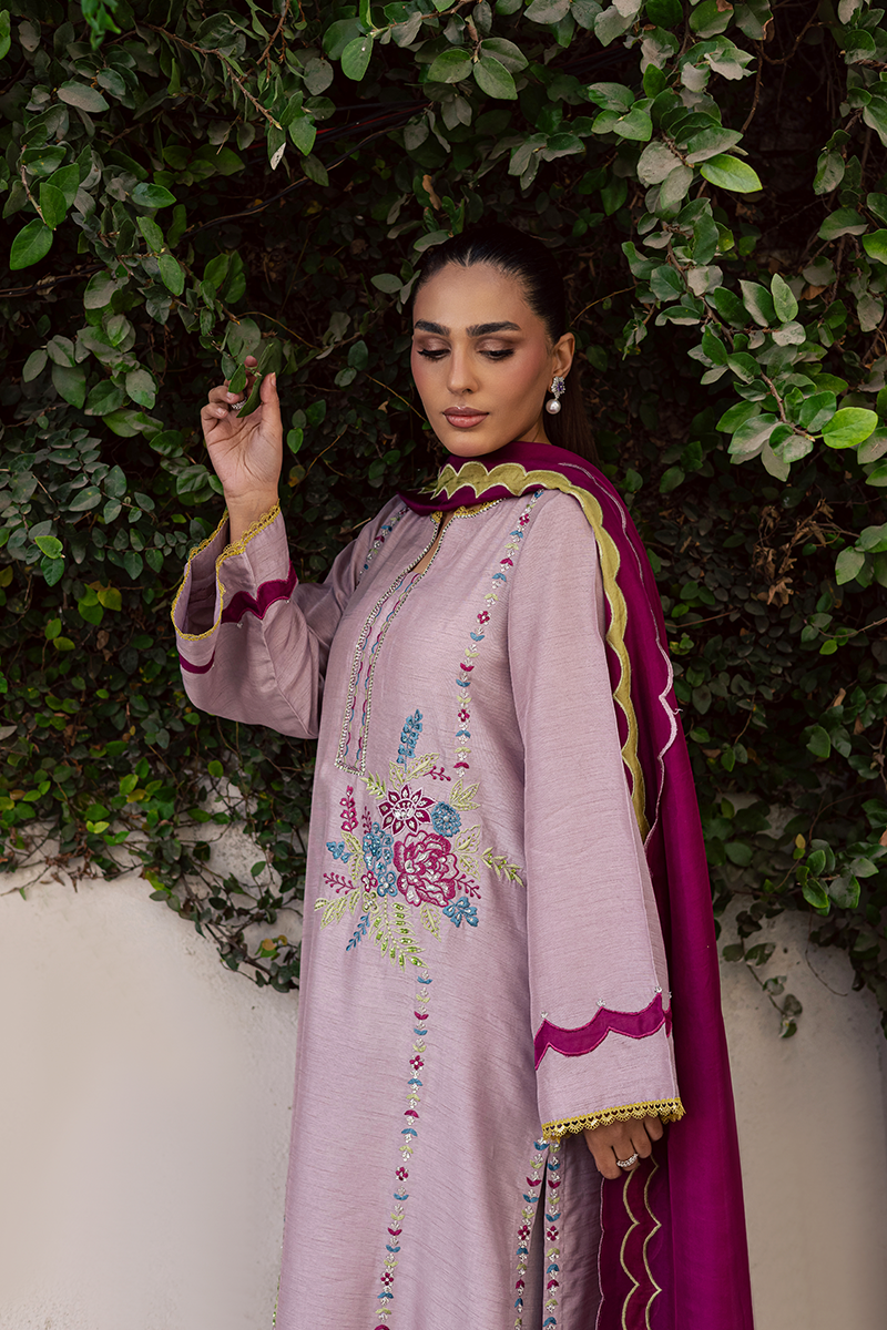 Mirth pulls full focus with a display of delicately adorned sequins and beads that illuminate the embroidered motifs enhanced with appliqué details. It is a true reflection of the brand’s signature attention to detail, with every stitch and embellishment thoughtfully placed. The accompanying silk dupatta complements the dress beautifully, with scalloped edges and appliqué borders all around, creating a cohesive and festive look. Perfect for the joyous occasion, this ensemble balances sophistication with celebratory charm, making it an ideal choice for Eid gatherings and festivities.Model's Outfit