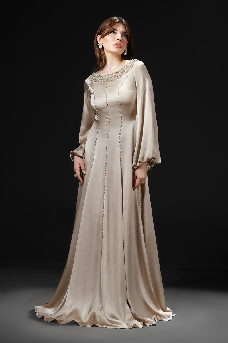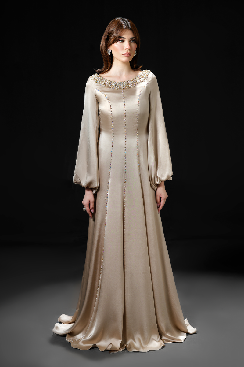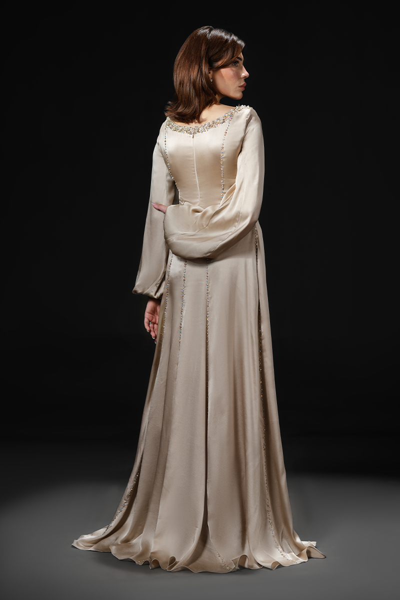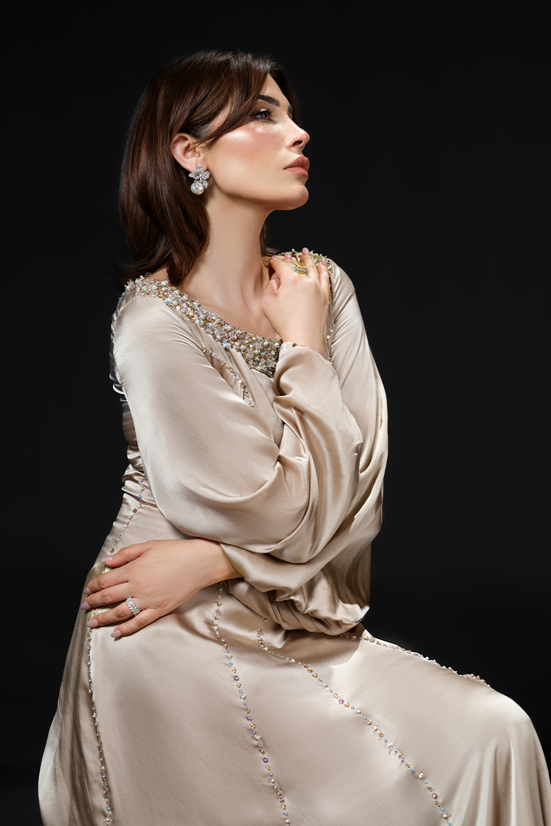 Made from pure charmeuse silk that effortlessly glides around your frame flattering the figure, this slinky gown’s hand embellished neckline and masterfully tailored panels are its focal points. The floor-skimming silhouette enhances the fluidity of the fabric creating a dramatic effect while the shimmering beads applied on the seams make for a striking finish. A perfect fit for bridal showers and wedding festivities!Model's Outfit