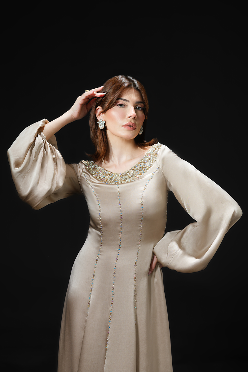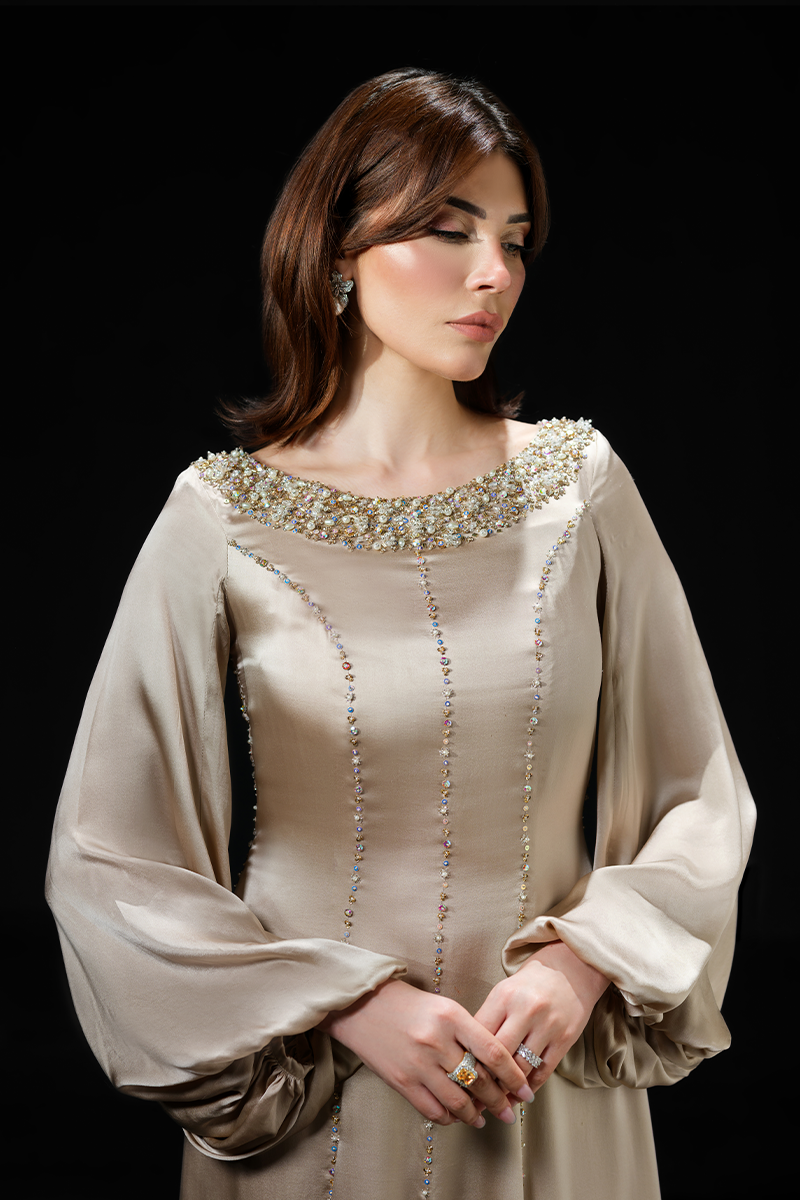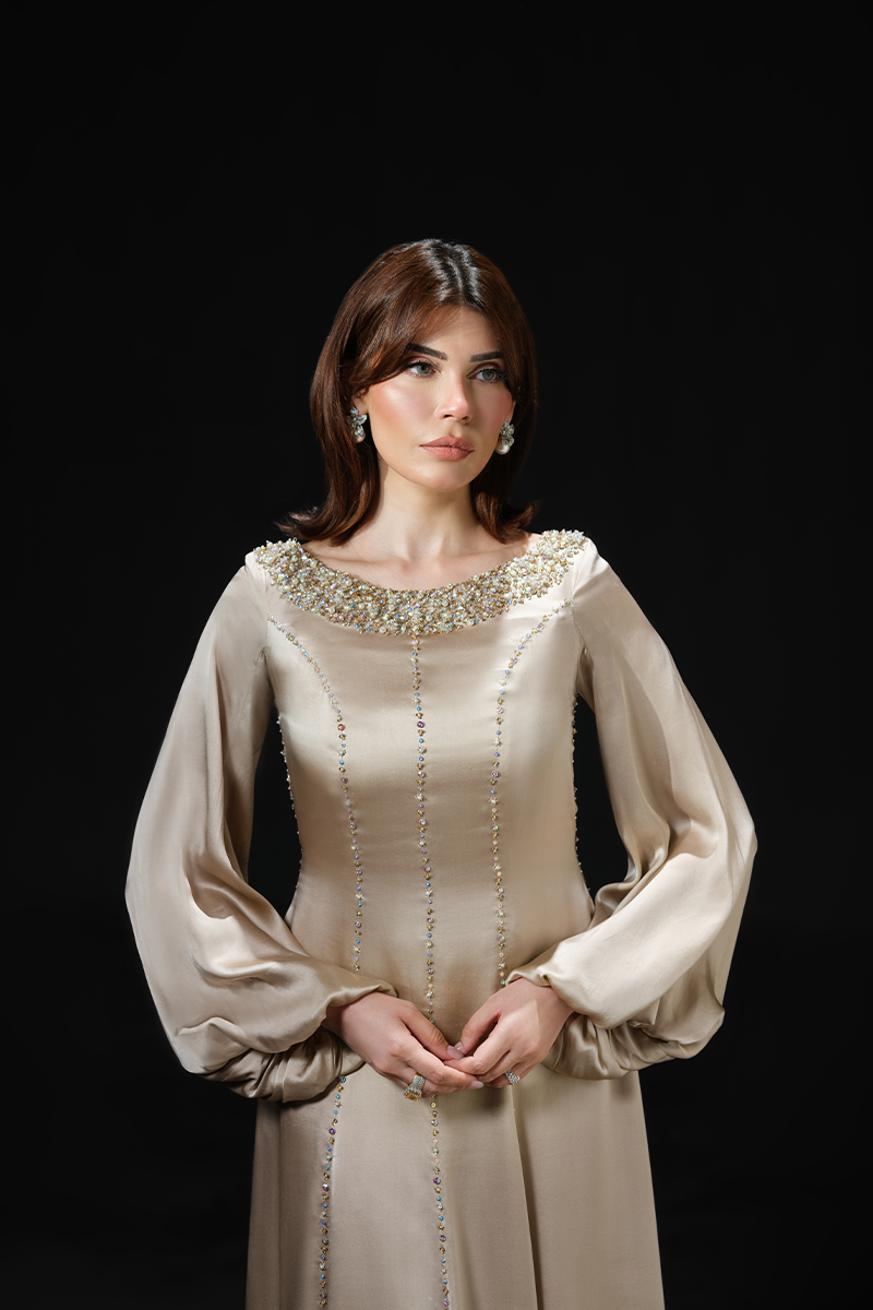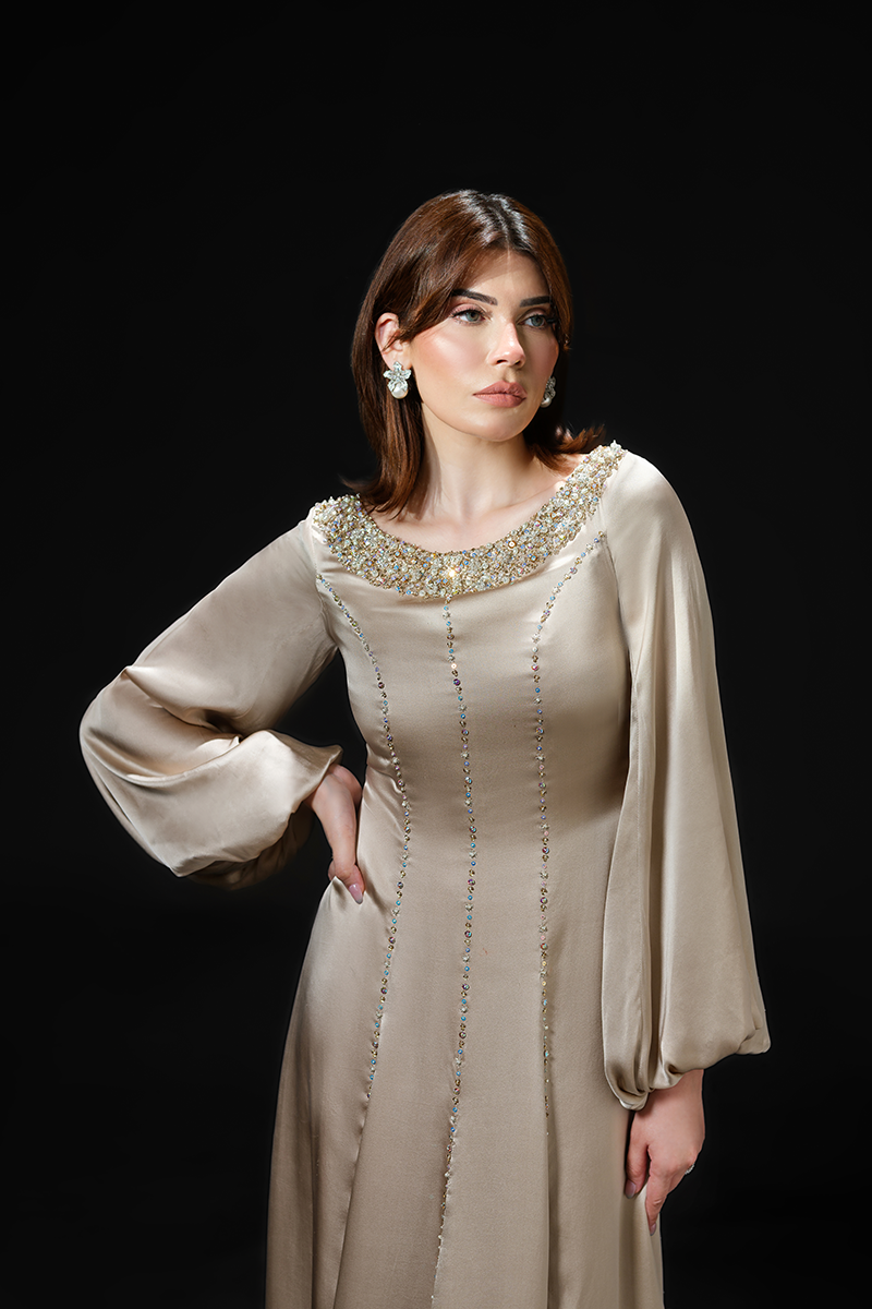 Made from pure charmeuse silk that effortlessly glides around your frame flattering the figure, this slinky gown’s hand embellished neckline and masterfully tailored panels are its focal points. The floor-skimming silhouette enhances the fluidity of the fabric creating a dramatic effect while the shimmering beads applied on the seams make for a striking finish. A perfect fit for bridal showers and wedding festivities!Model's Outfit