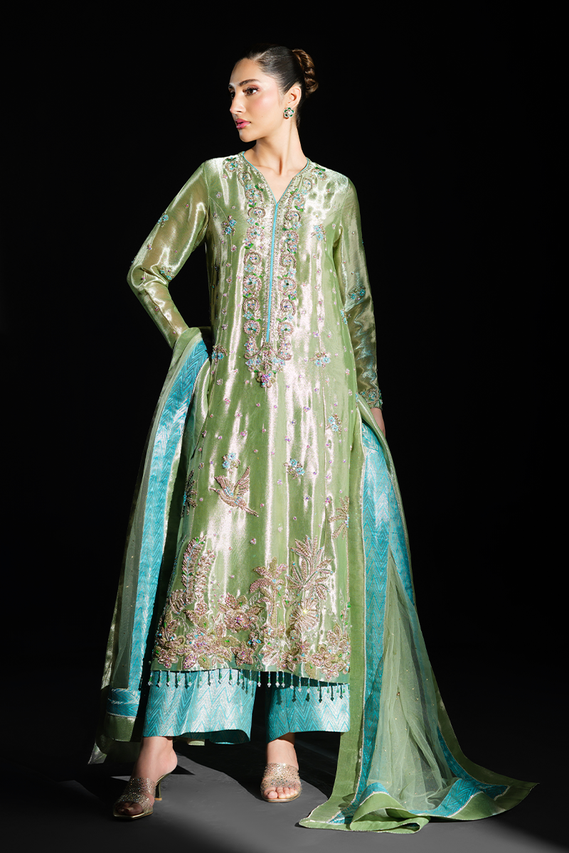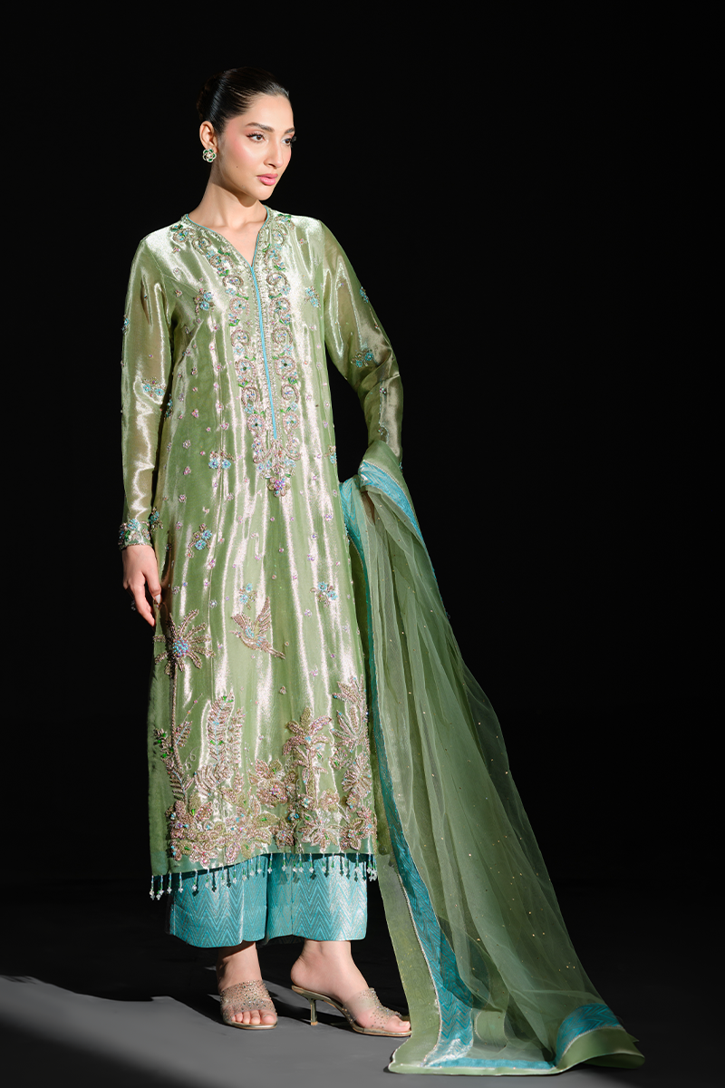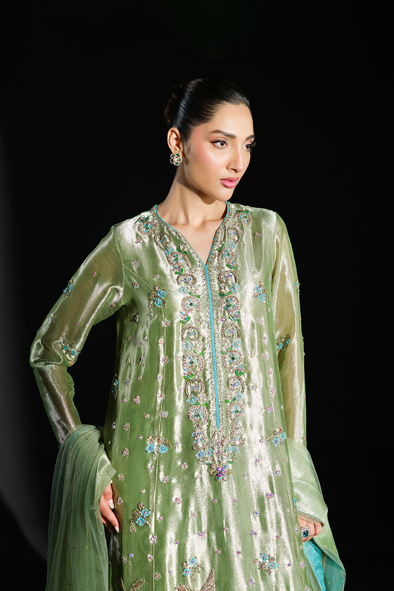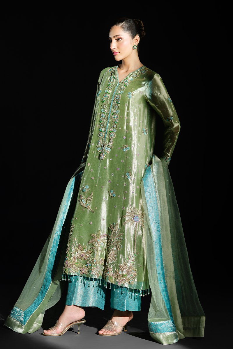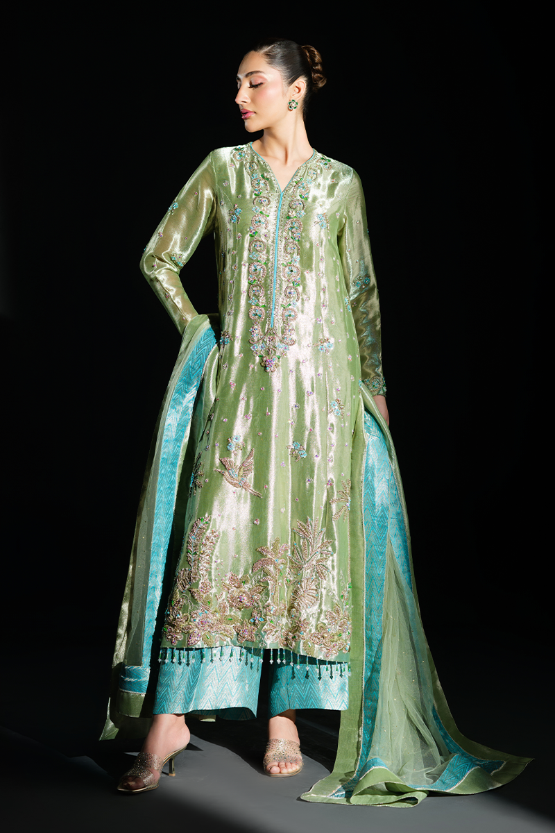 Fashioned from pure lustrous tissue, this dazzling creation celebrates grandeur in true sense of the word. Palm trees, birds and floral motifs encrusted with hand stitched scintillating crystals, beads, sequins and zardozi on the green expanse make it a feat of true artisanal craftsmanship. Paired with pure silk Jamavaar pants and beautifully designed net dupatta, Peridot has all the features to aid you in making a memorable fashion statement. A fully handcrafted splendid marvel!Model's Outfit