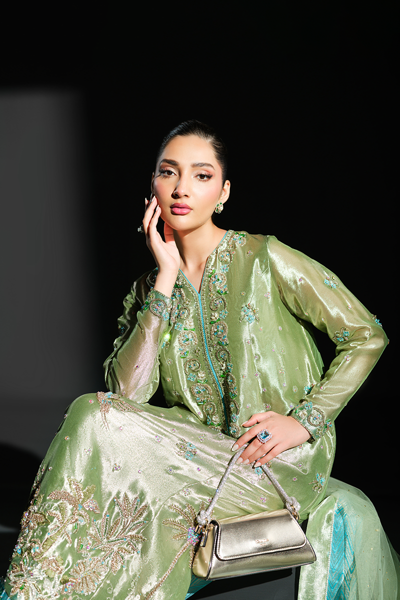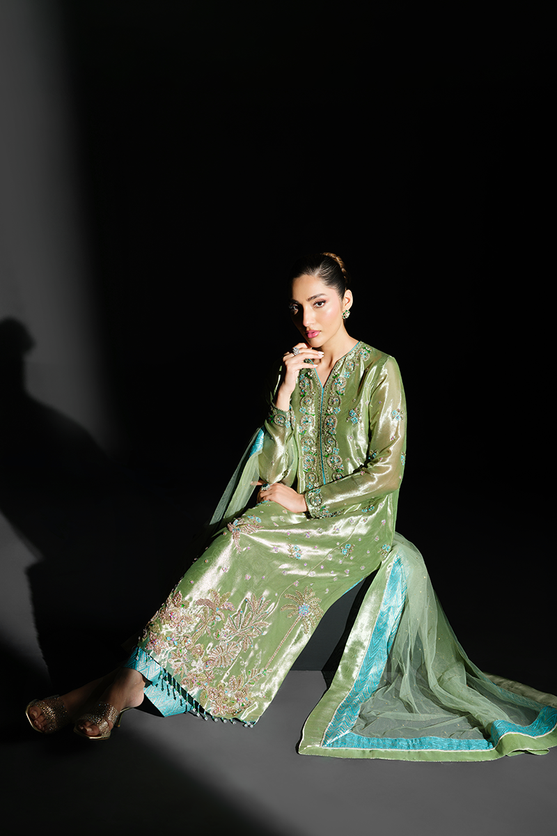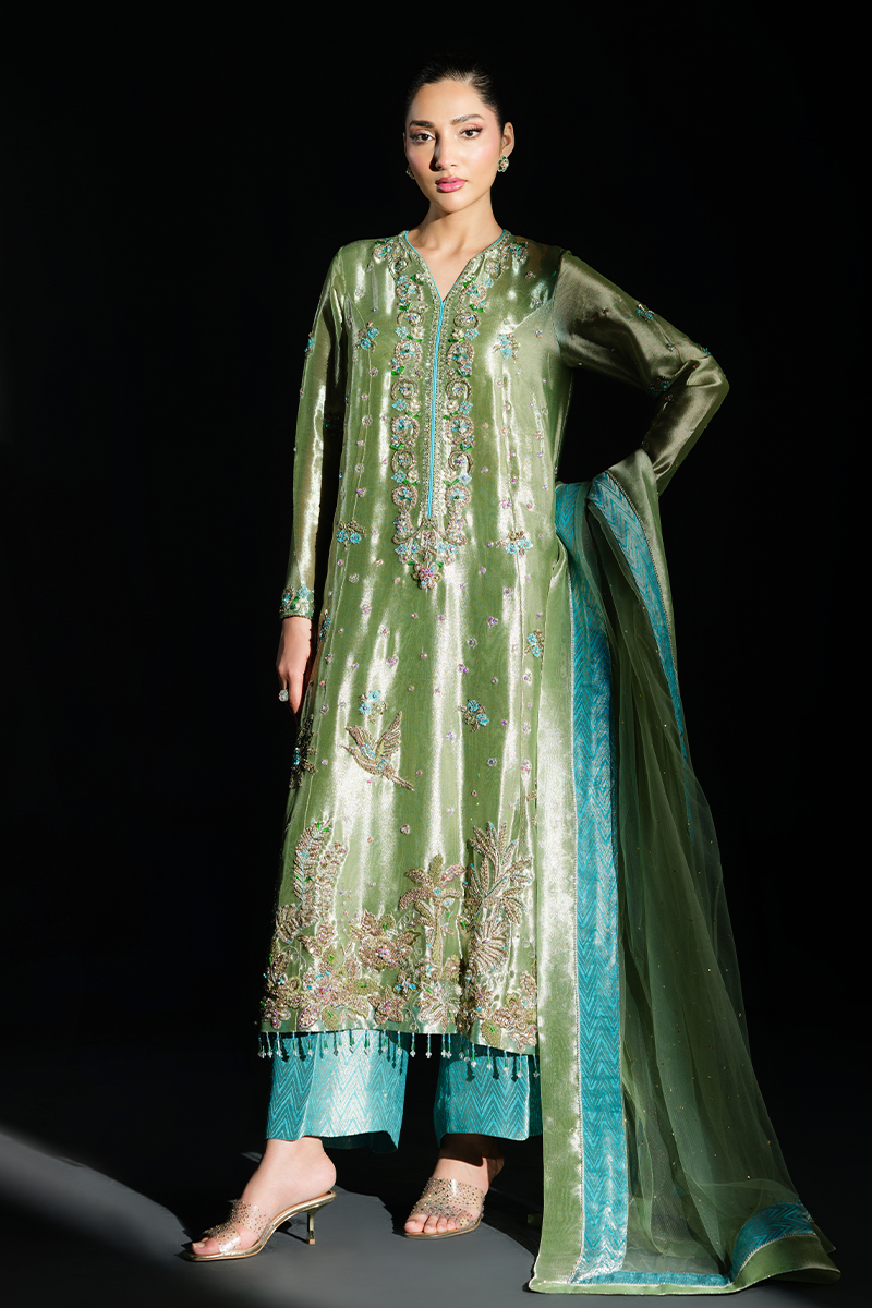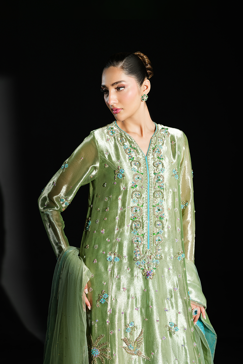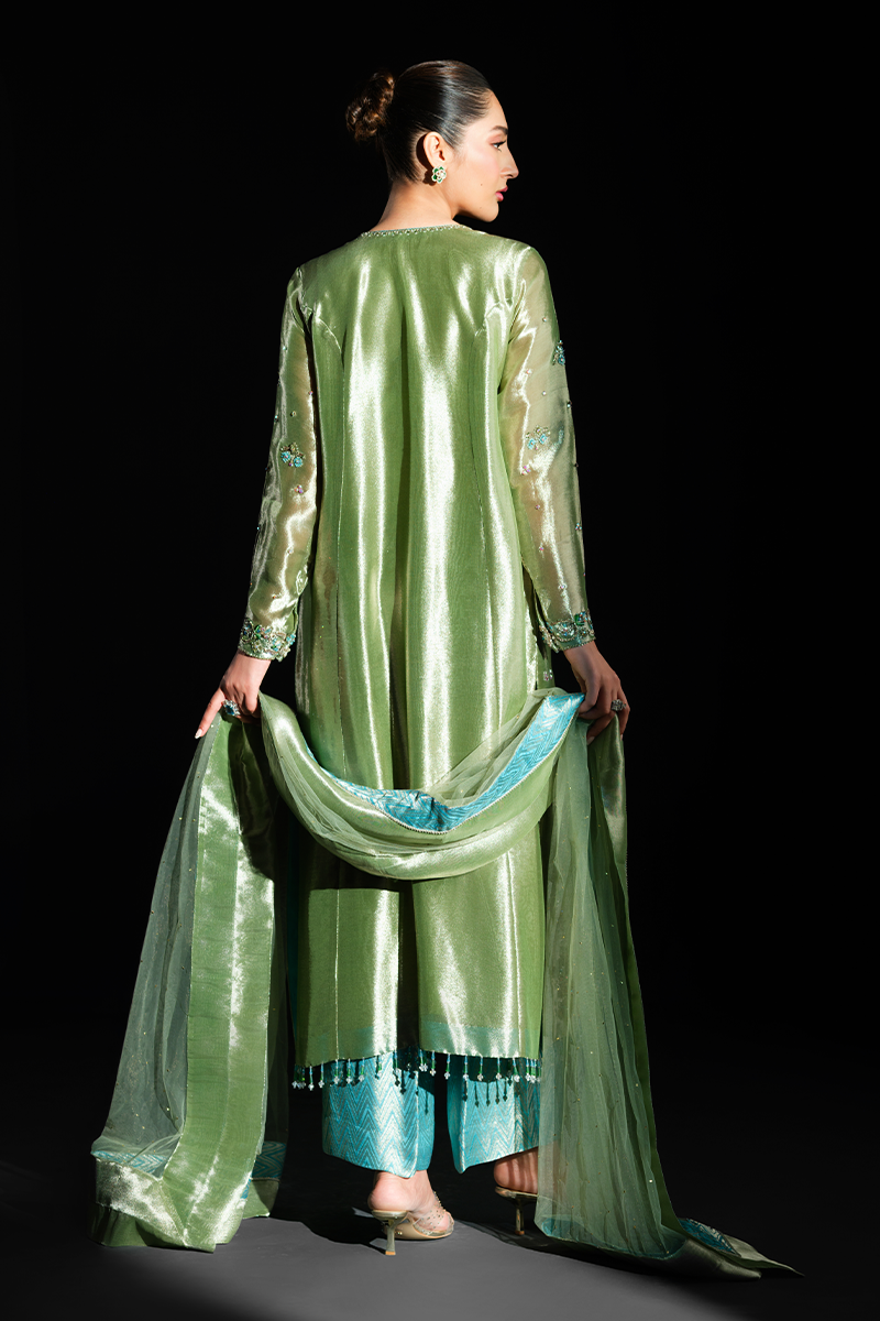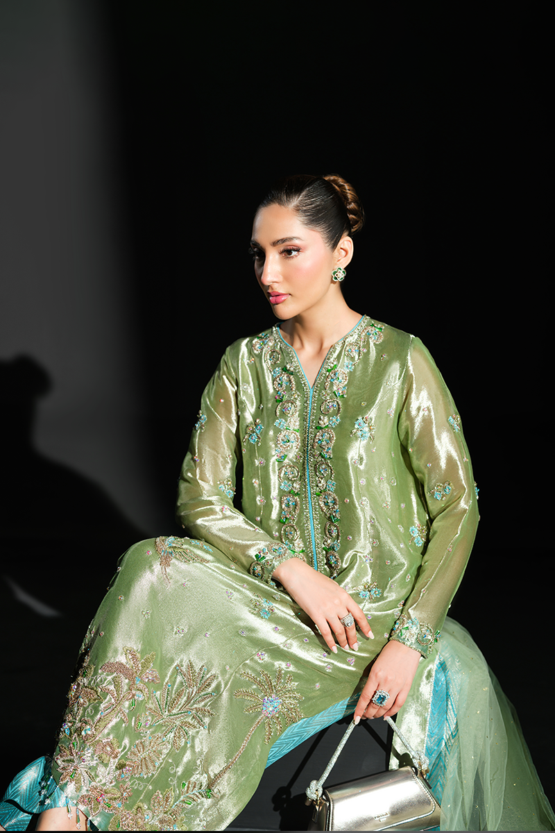 Fashioned from pure lustrous tissue, this dazzling creation celebrates grandeur in true sense of the word. Palm trees, birds and floral motifs encrusted with hand stitched scintillating crystals, beads, sequins and zardozi on the green expanse make it a feat of true artisanal craftsmanship. Paired with pure silk Jamavaar pants and beautifully designed net dupatta, Peridot has all the features to aid you in making a memorable fashion statement. A fully handcrafted splendid marvel!Model's Outfit