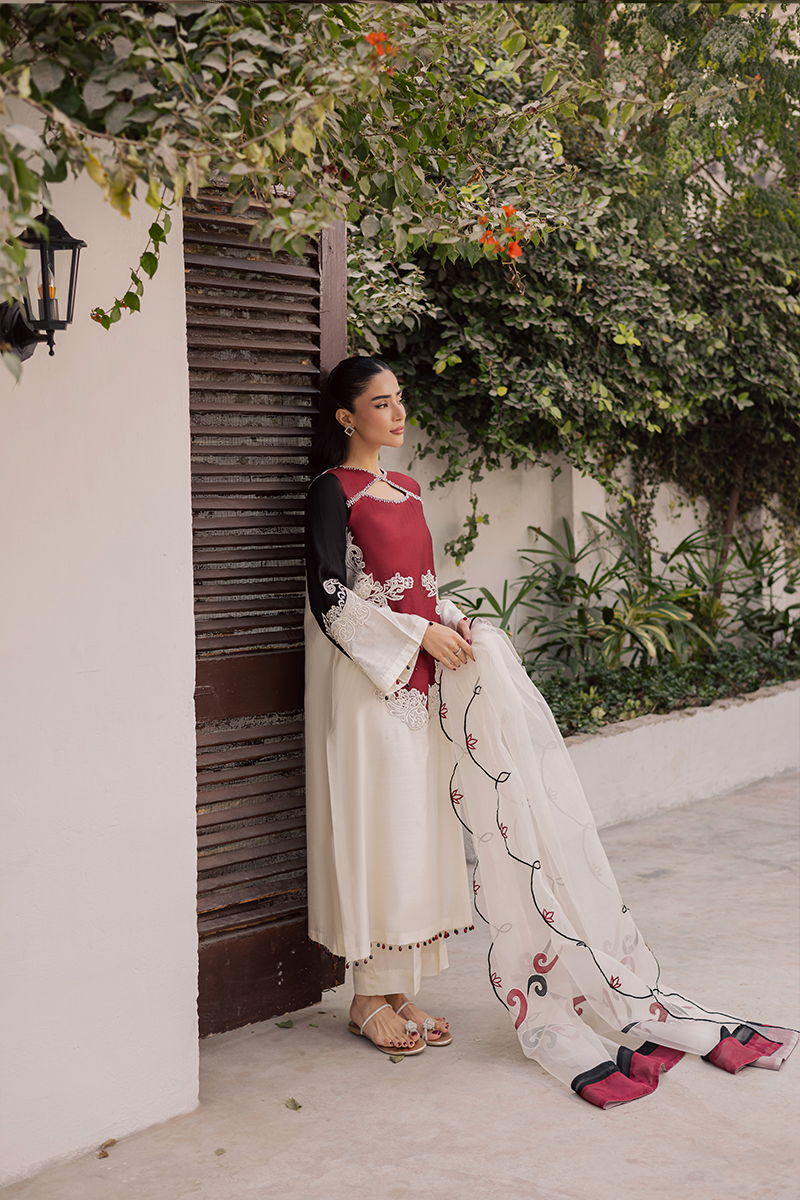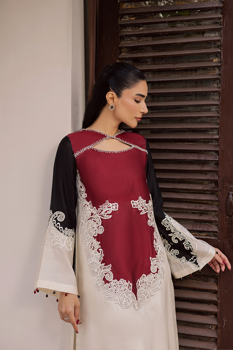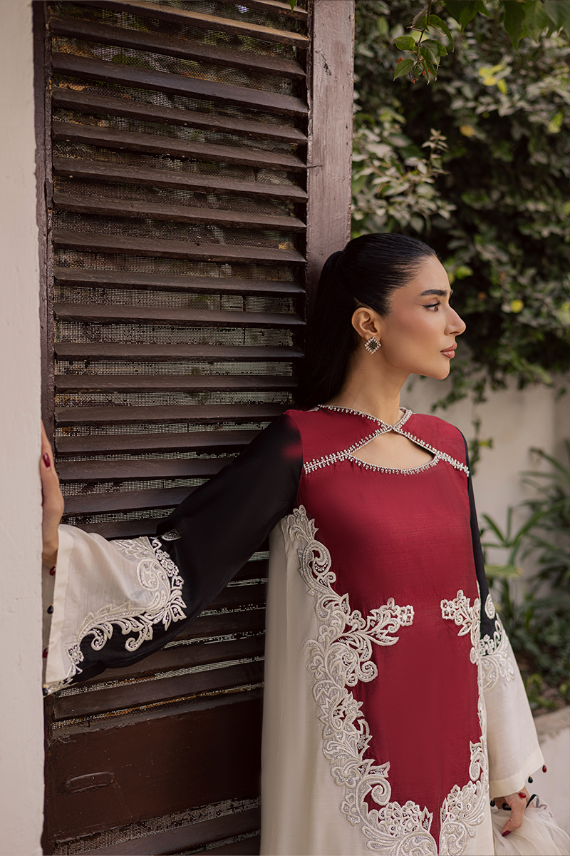 Bask in rapture amidst festivities and celebration with this elegant design that shines with luxe appeal and endless sophistication. From its dramatic neck elevated by hand applied sequins and beads to the appealing colour block construction with artistic embroidered motifs on the finest Khaddi silk, each element speaks to the brand’s exceptional craftsmanship. This ensemble is destined to draw admiration and looks of awe as you show it off paired with diaphanous embroidered dupatta in complementing hues.Model's Outfit