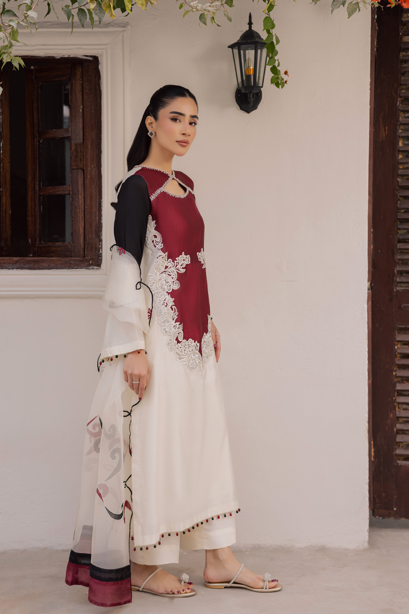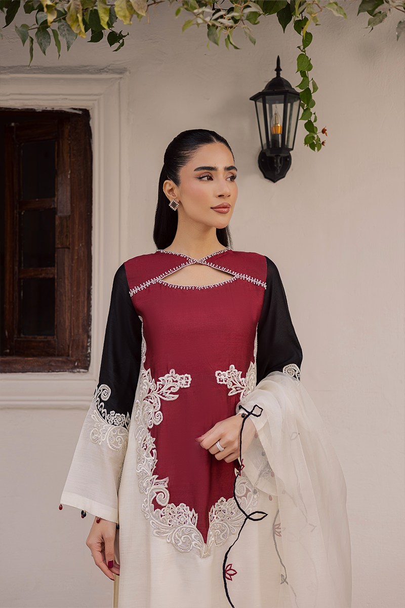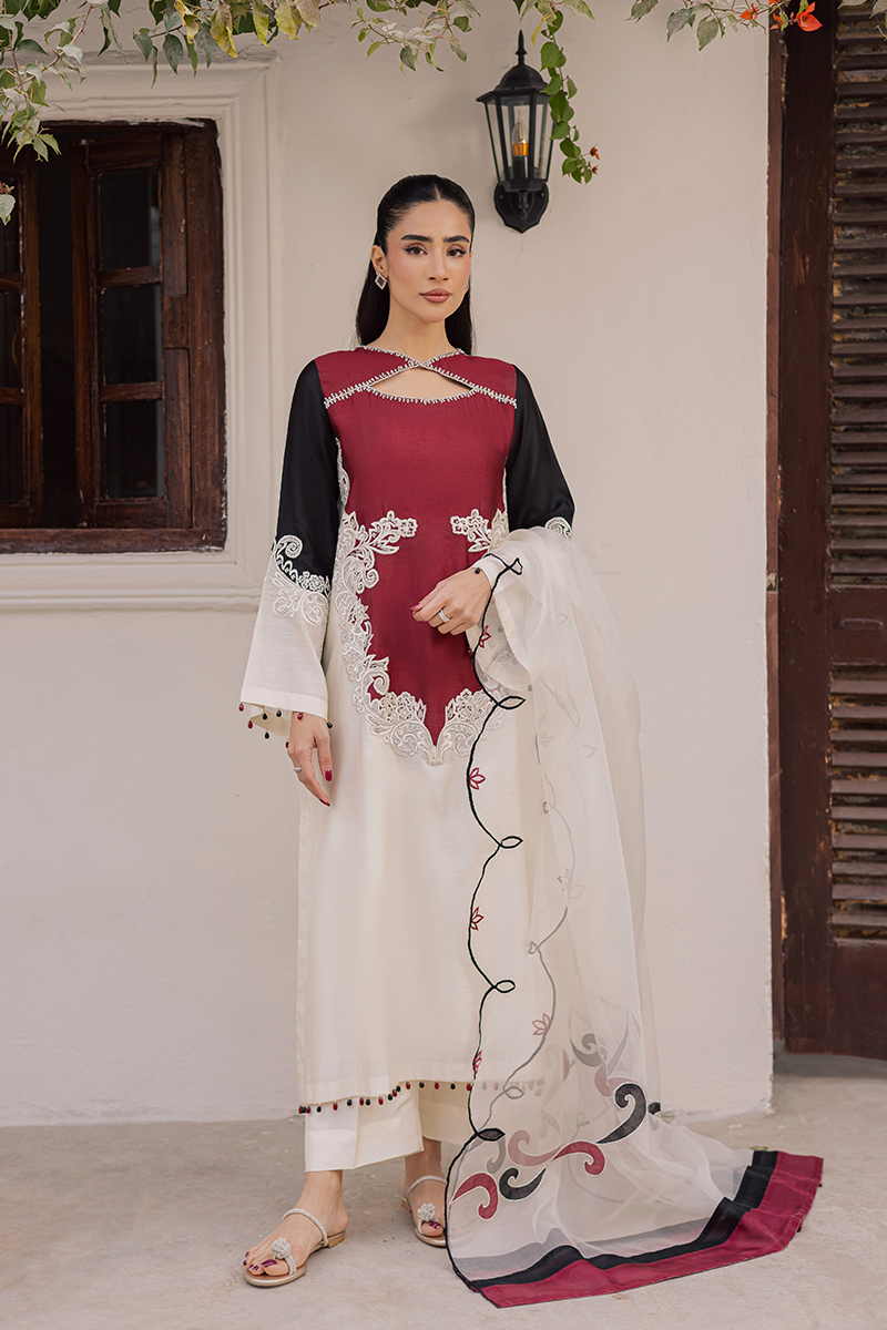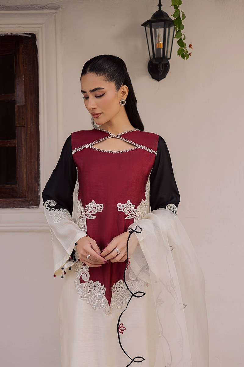 Bask in rapture amidst festivities and celebration with this elegant design that shines with luxe appeal and endless sophistication. From its dramatic neck elevated by hand applied sequins and beads to the appealing colour block construction with artistic embroidered motifs on the finest Khaddi silk, each element speaks to the brand’s exceptional craftsmanship. This ensemble is destined to draw admiration and looks of awe as you show it off paired with diaphanous embroidered dupatta in complementing hues.Model's Outfit