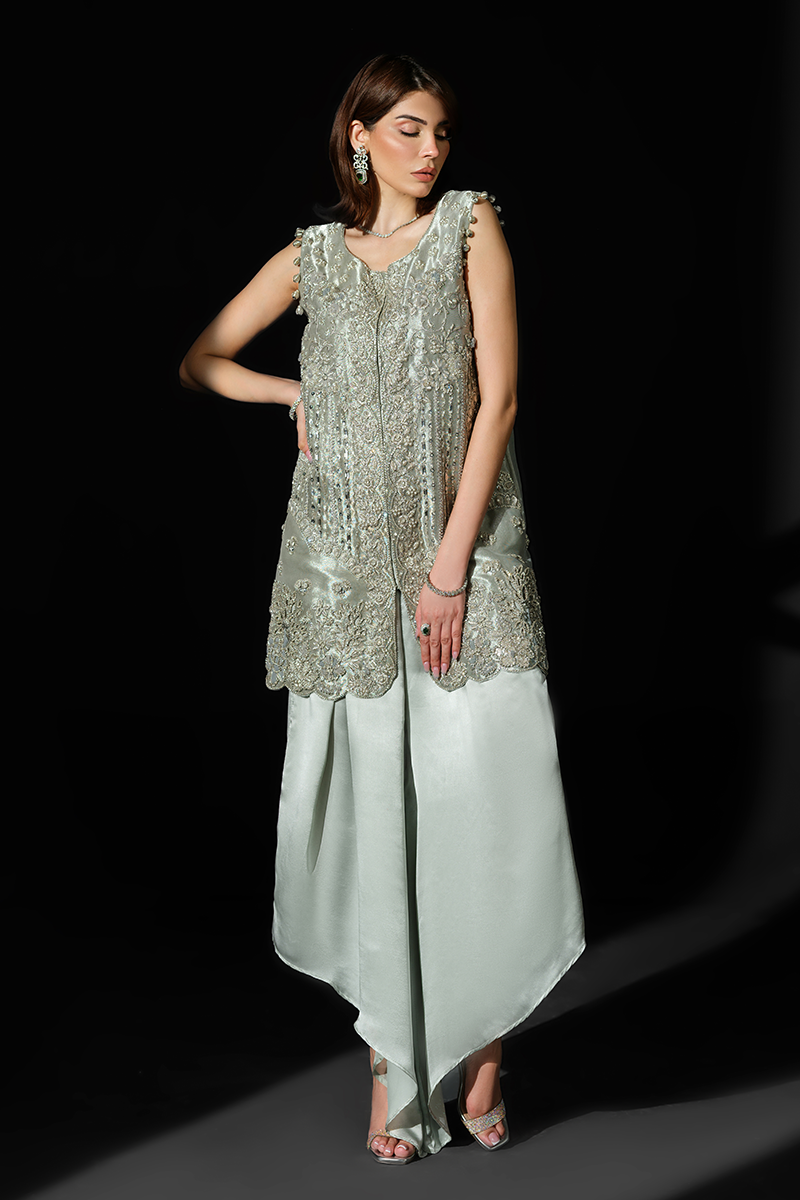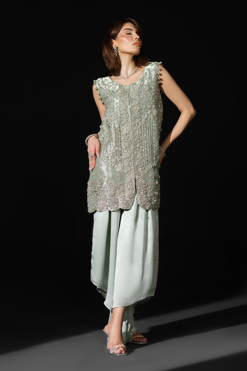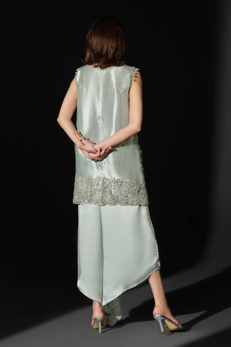 Featuring a sleeveless jacket crafted from pure tissue, encrusted with an array of hand applied sequins and beads and dazzling zardozi work, this stunning creation has been rightly named Rigel, the sparkling star, to make you shine your brightest at every soiree. Expertly tailored silhouette and a heavily handcrafted exterior display exceptional artistry. The accompanying stylish asymmetrical charmeuse silk pants inject glamour into the ensemble heightening its intrigue. Get ready to command the spotlight and garner compliments as you step out in this beauty.Model's Outfit