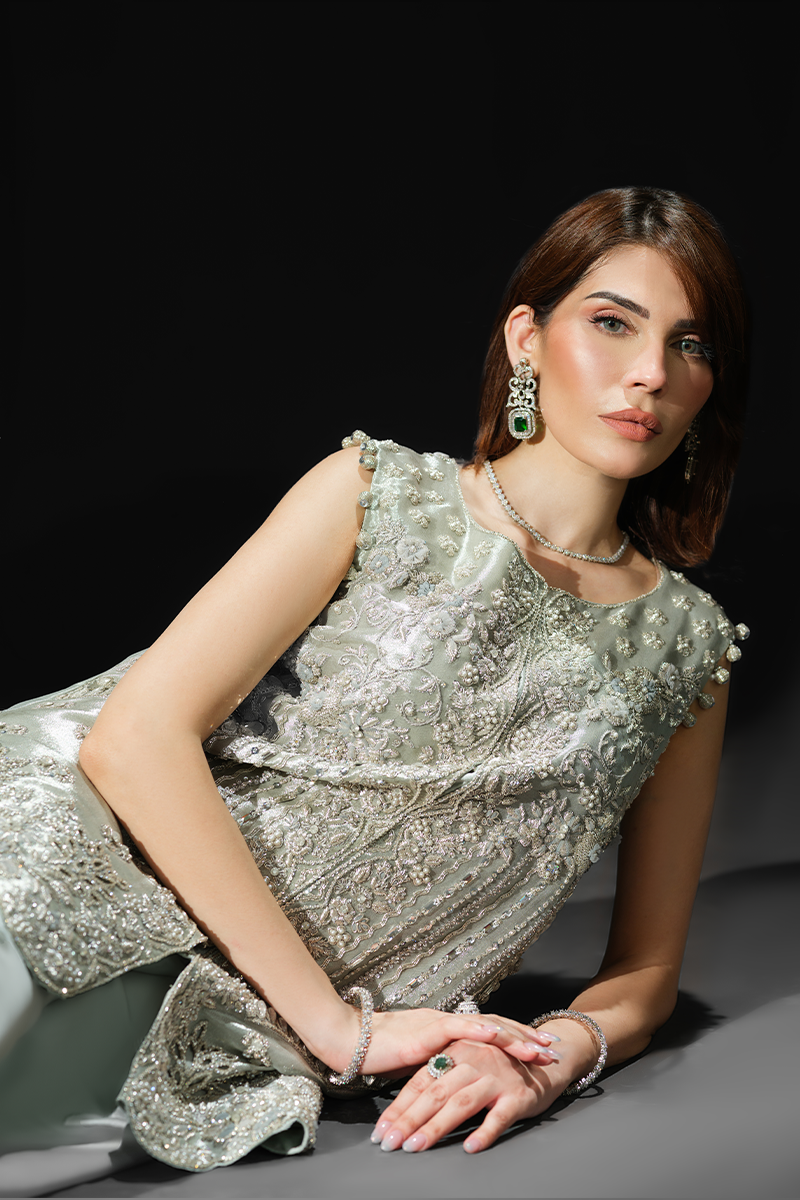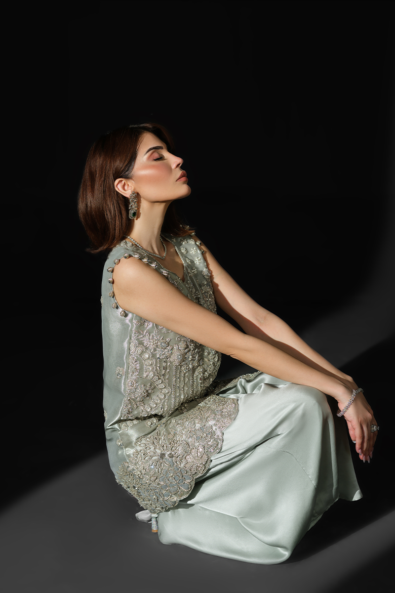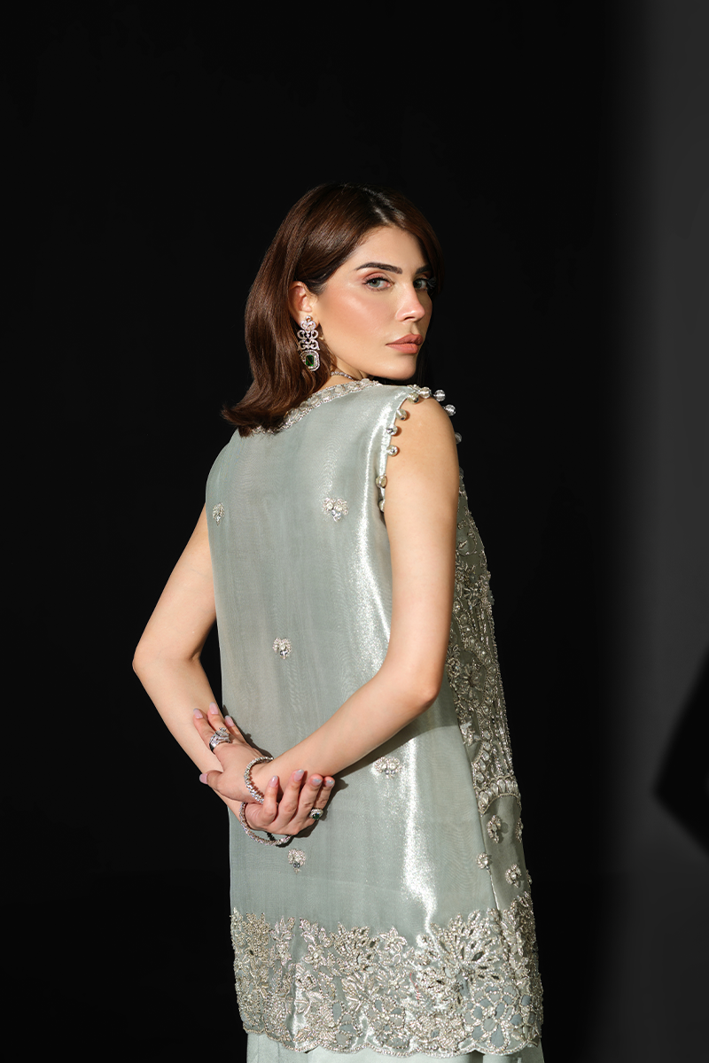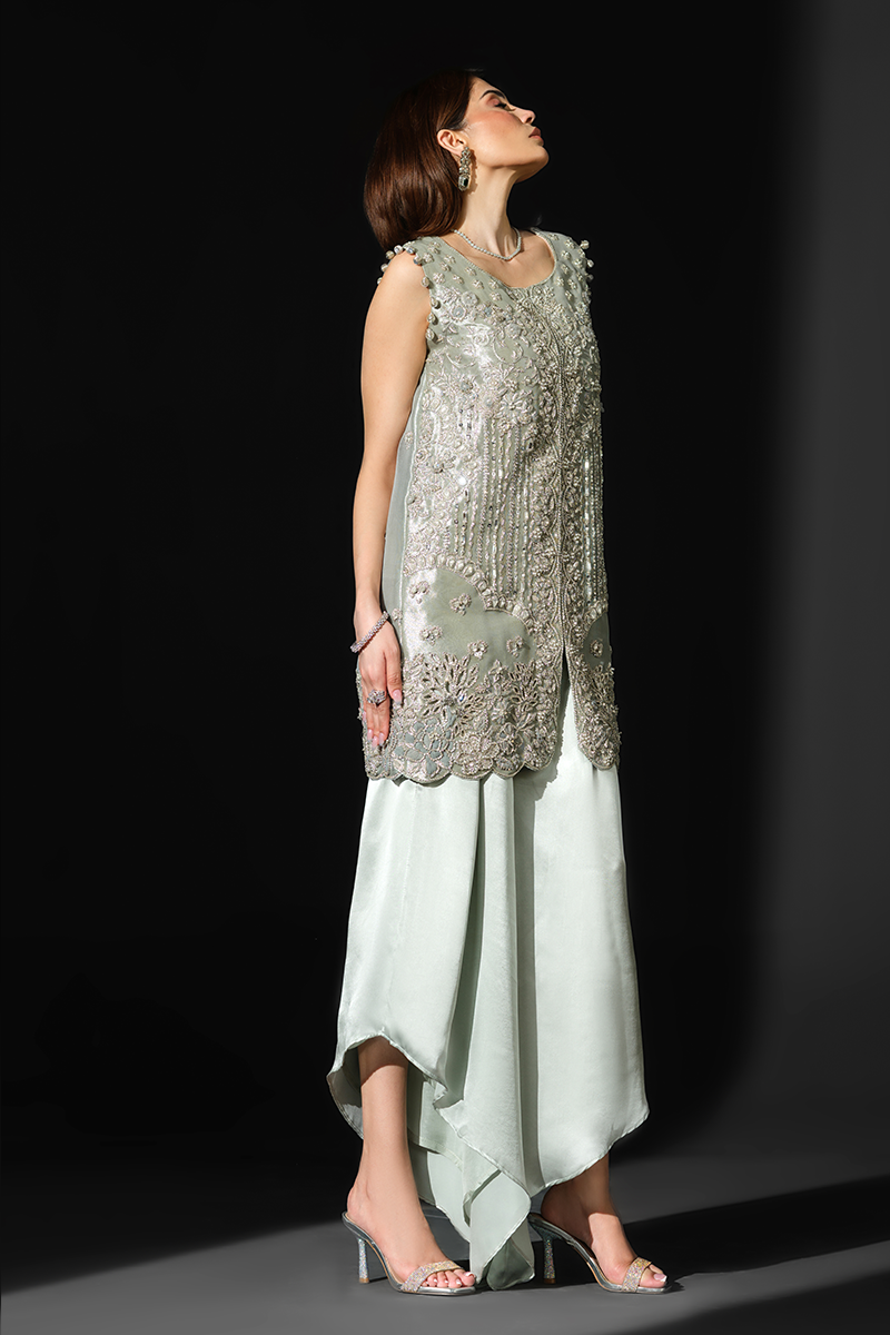 Featuring a sleeveless jacket crafted from pure tissue, encrusted with an array of hand applied sequins and beads and dazzling zardozi work, this stunning creation has been rightly named Rigel, the sparkling star, to make you shine your brightest at every soiree. Expertly tailored silhouette and a heavily handcrafted exterior display exceptional artistry. The accompanying stylish asymmetrical charmeuse silk pants inject glamour into the ensemble heightening its intrigue. Get ready to command the spotlight and garner compliments as you step out in this beauty.Model's Outfit
